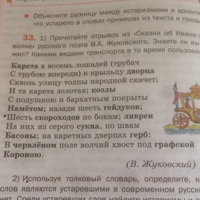 Козлы, скороходов и графской короной тоже не устаревшее слово, а вот слова наметом, гейдуков, ливреи, басоны, червлёном устаревшие словп