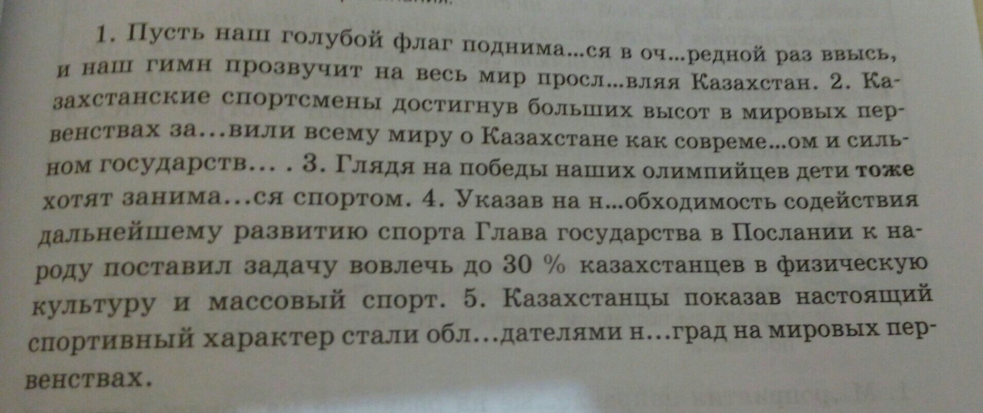 5. Казахстанцы, /показав настоящий спортивный характер/, стали обладателями (словарное слово) наград (словарное слово) на мировых первенствах.