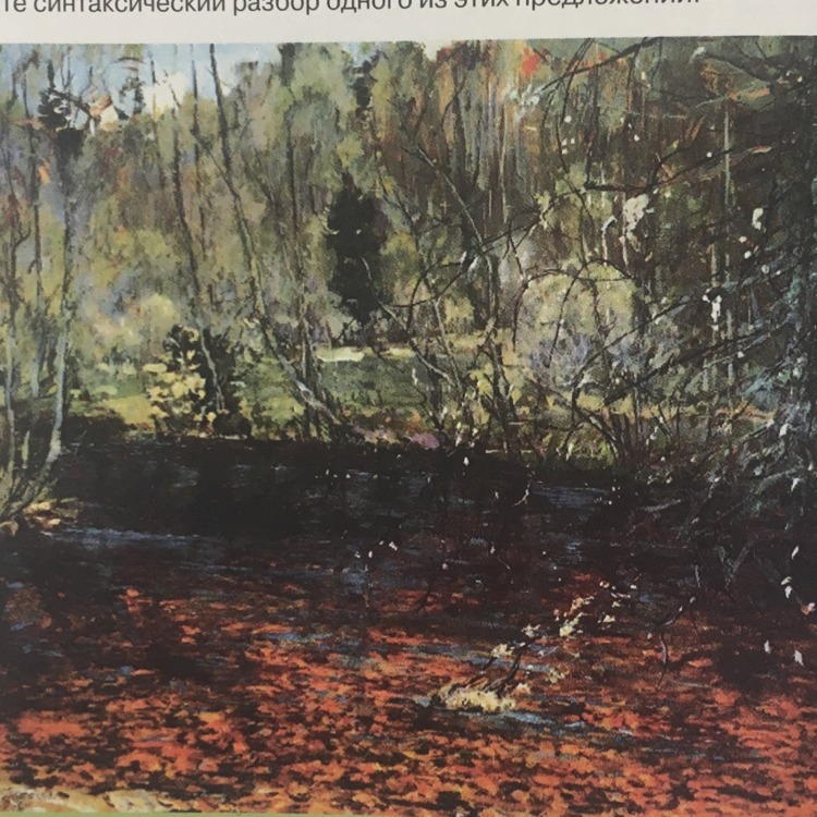 на этой картине показана прекрасная осень.на речку упали оранжево-золотистые листья.над густым лесом виднеется чистое небо с пушистыми облаками.немного далеко очень темно.