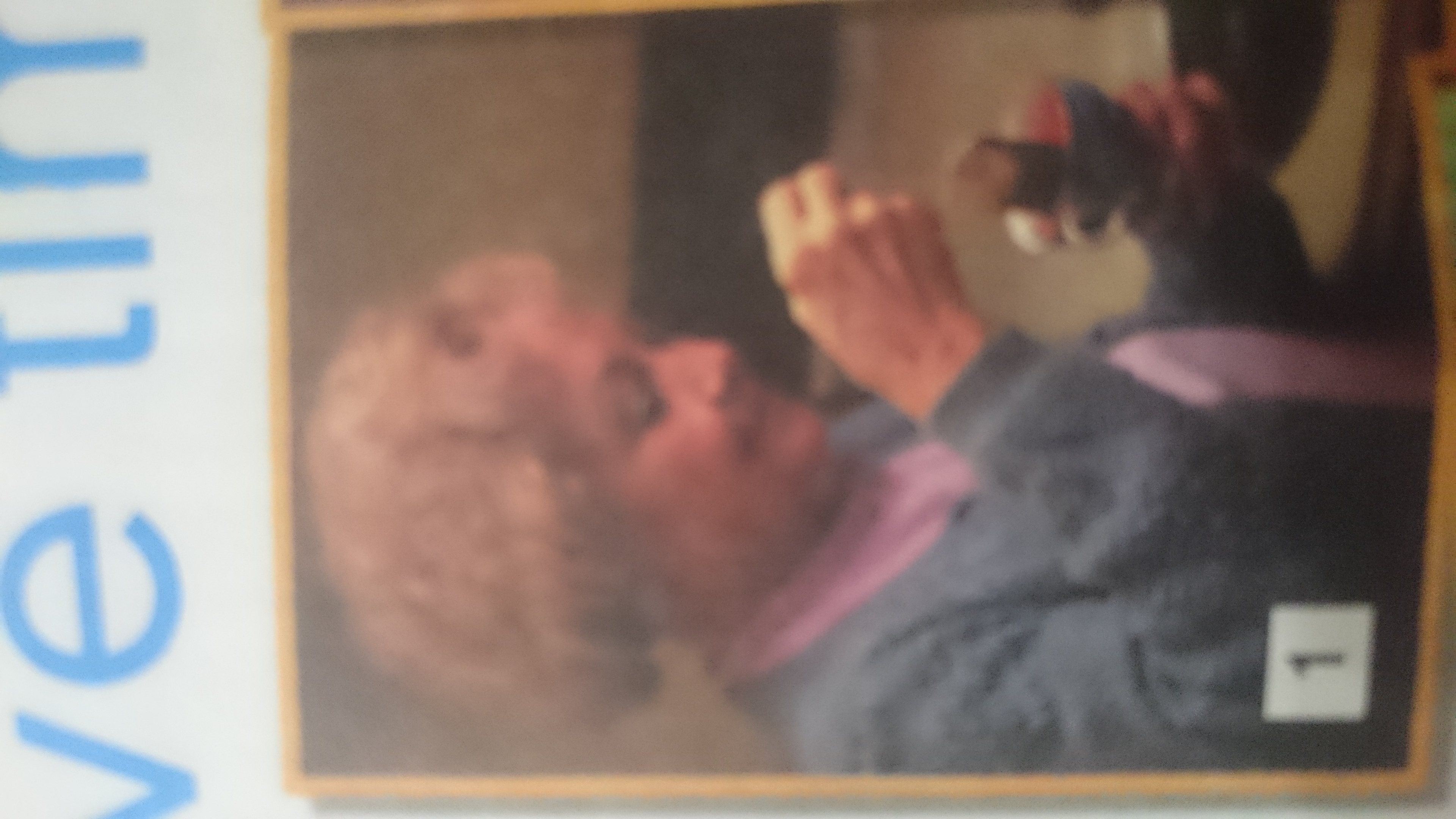 На этой фотографии мы видим улыбающуюся старушку, одетую в синее и фиолетовое с короткими, белыми волосами. У нее ясные глаза и черные брови. Женщина стоит на кухне и делает чай. Может быть, она делает чай для своих внуков. Следует переводить в самому тексты ответов, перед тем, как писать в тетрадь ;)