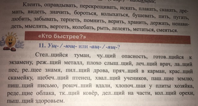 Стелющиеся туман, чующий опасность, готовящийся к экзамену, режущий металл, плохо слышащий, лечащий врач, лающий пёс, реющее знамя, пилящий дрова, прячущий в карман, красящий скамейку, щебечущий птенец, хвалящий учеников, пашущие землю, пишущий письмо, рокочущий вдали, хлопочущая у плиты хозяйка, редеющие облака, ткущий ковёр, делящий на части, колющий орехи, пышущий здоровьем.