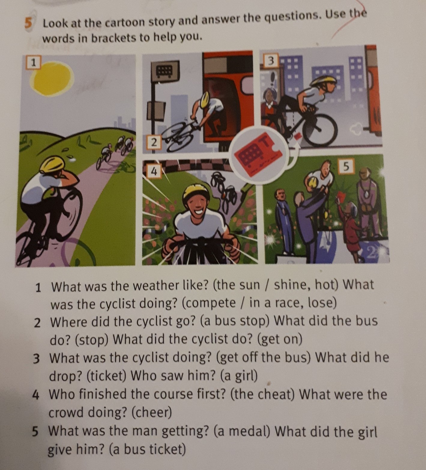 The weather outside is great! The cyclist is going threw a marathon and trying to win it. He likes cheating so he went to a bus stop and rode a bus to the end of the marathon. He finished the course 1 place! He is very happy but he feels that it was not fair.