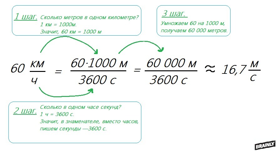 - В числителе дроби (над дробной чертой), где написано "км", нужно сделать перевод из км в м. Так как 1 км = 1000 м, то данное нам количество км нужно умножить на 1000. 60 км = 60·1000 = 60 000 м. Это в числителе.