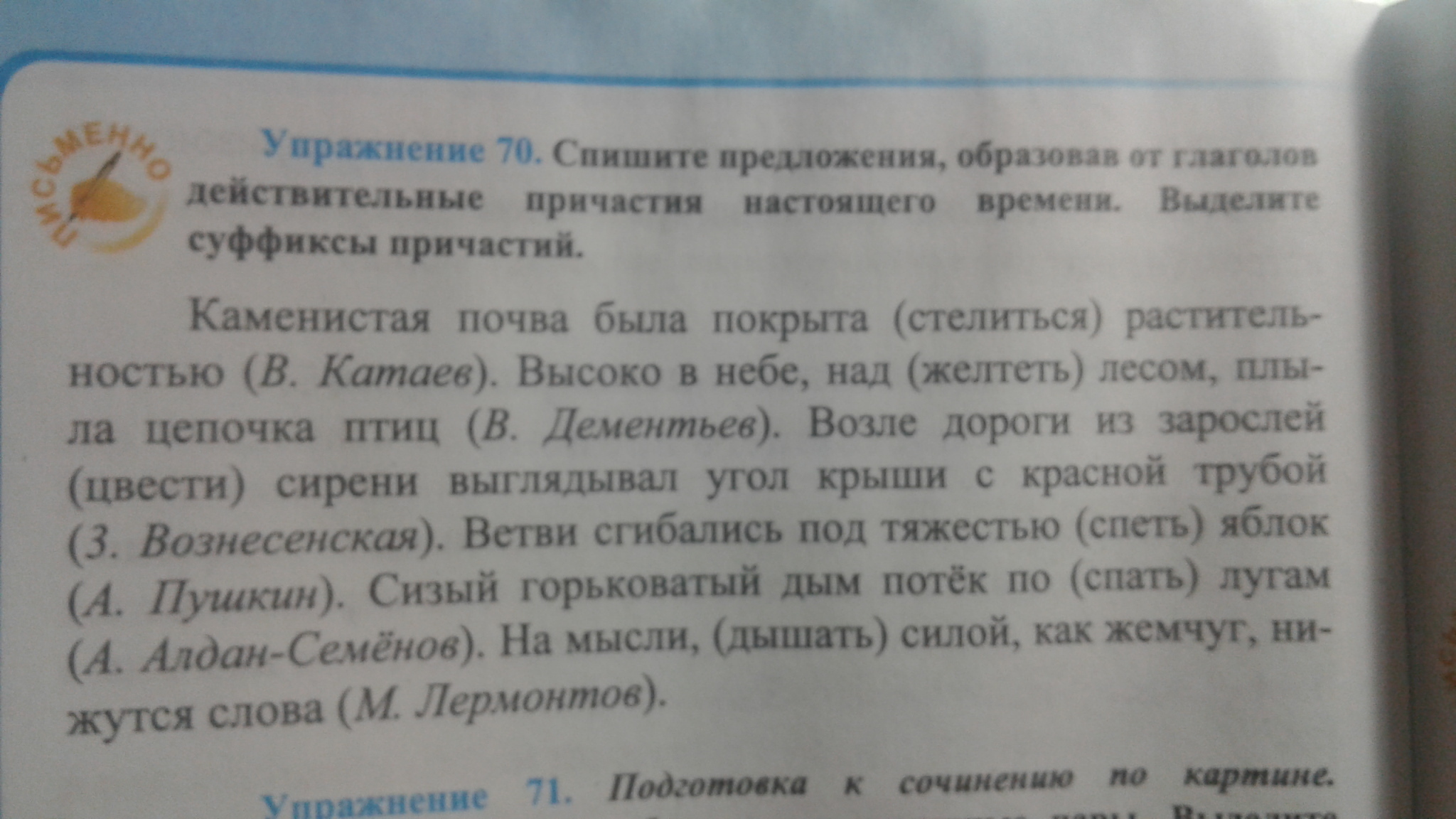 Спишите предложения образовав от глаголов действительные причастия настоящего времени. Выделите суффиксы причастий. Каменистая почва была покрыта (стелется) растительностью. Высоко в небе, над (желтеть) лесом, плыла цепочка птиц Возле дороги из зарослей (цвести) сирени выглядывал угол крыши с красной трубой. Ветви сгибаясь под тяжестью (спеть) яблок. Сизый горьковатый дым потёк по (спать) лугам. На мысли, (дышать) силой,как жемчуг, нижутся слова. ПОМОГИТЕ ПОЖАЛУЙСТА