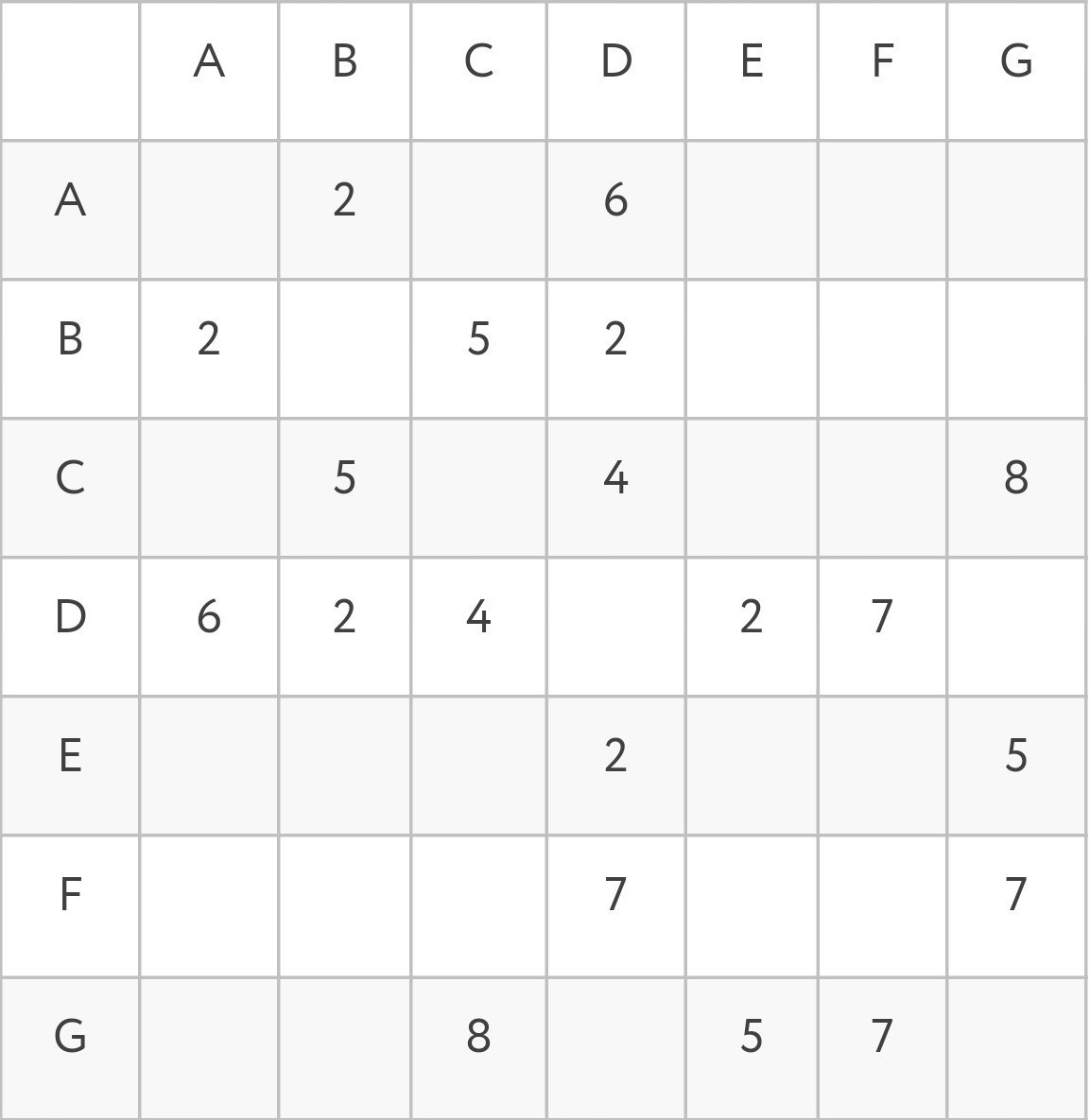 Между населёнными пунктами A, B, C, D, E, F, G построены дороги, протяжённость которых приведена в таблице.