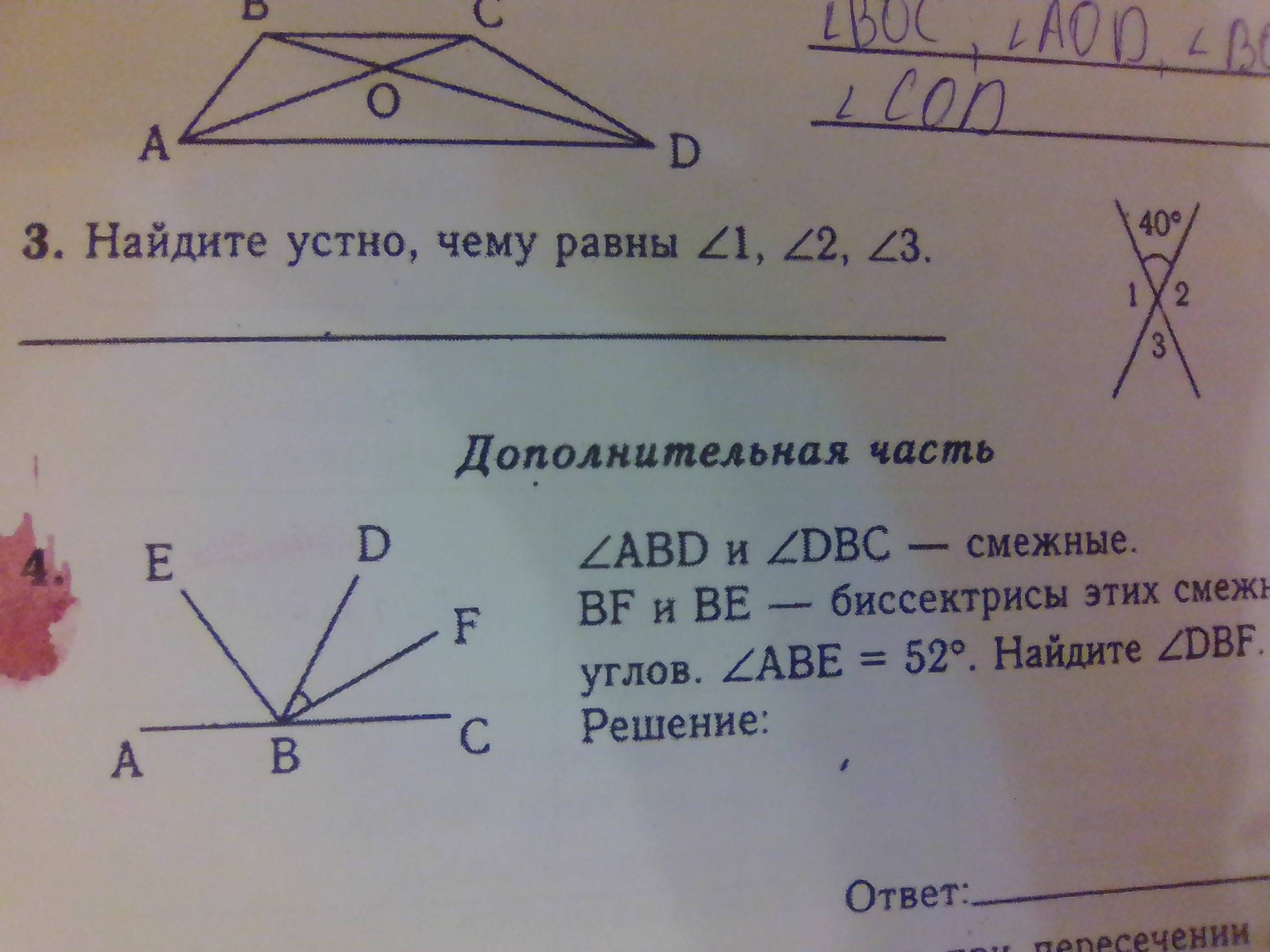 Все довольно просто. Так как BE биссектриса, а она делит угол пополам, то угол ABD равен 52 + 52 = 104°. Так как ABD и DBC смежные углы, то DBC = 180° - 104° = 76°. В тот же момент так как BF биссектриса угла DBС, то DBF = FBC=76/2=38°