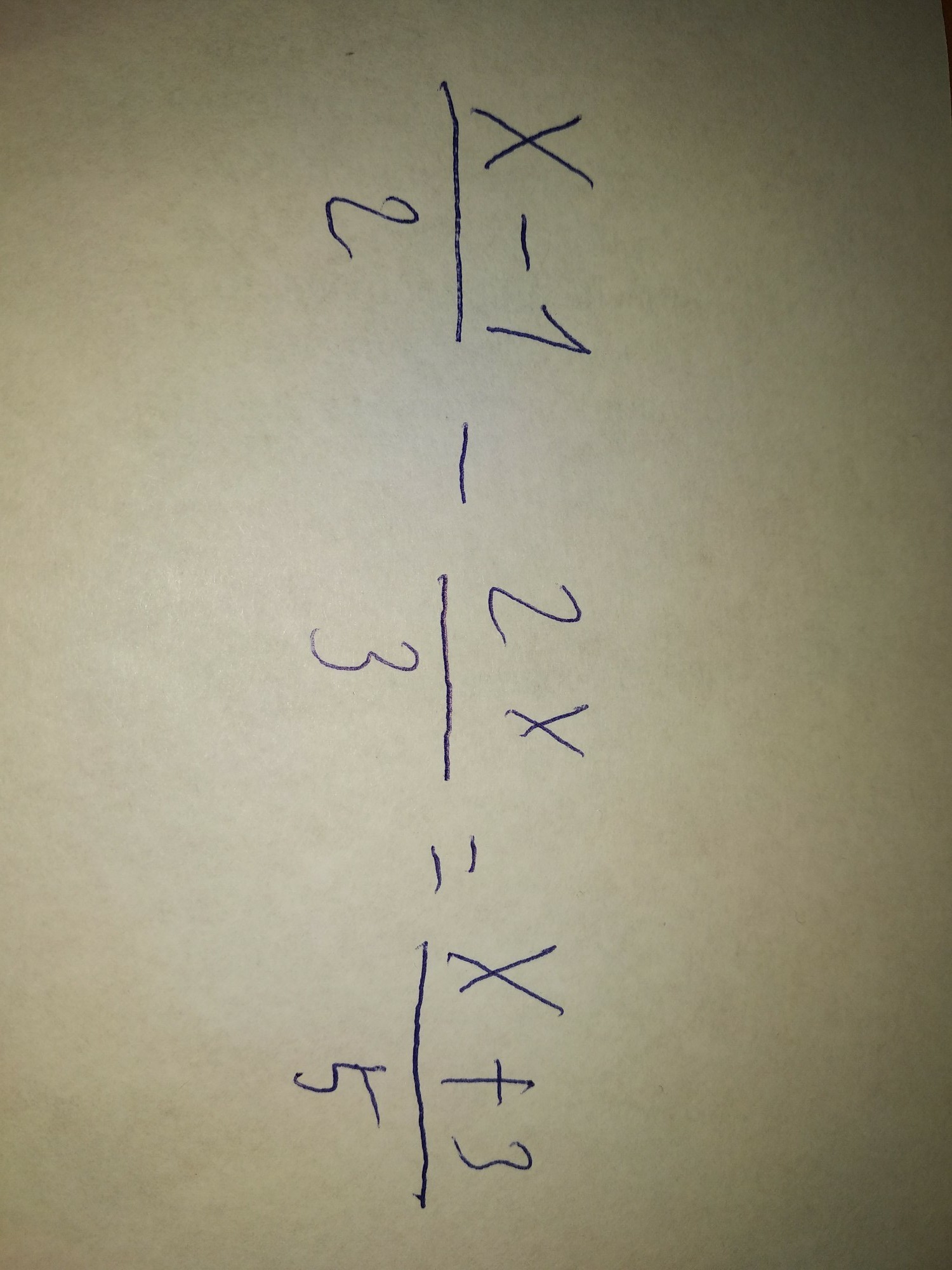 frac{x - 1}{2}  -  frac{2x}{3}  =  frac{x + 3}{5}  \ 15(x - 1) - 10 times 2x = 6(x + 3) \ 15x - 15 - 20x = 6x + 18 \ 11x =  - 33 \ x =  - 3