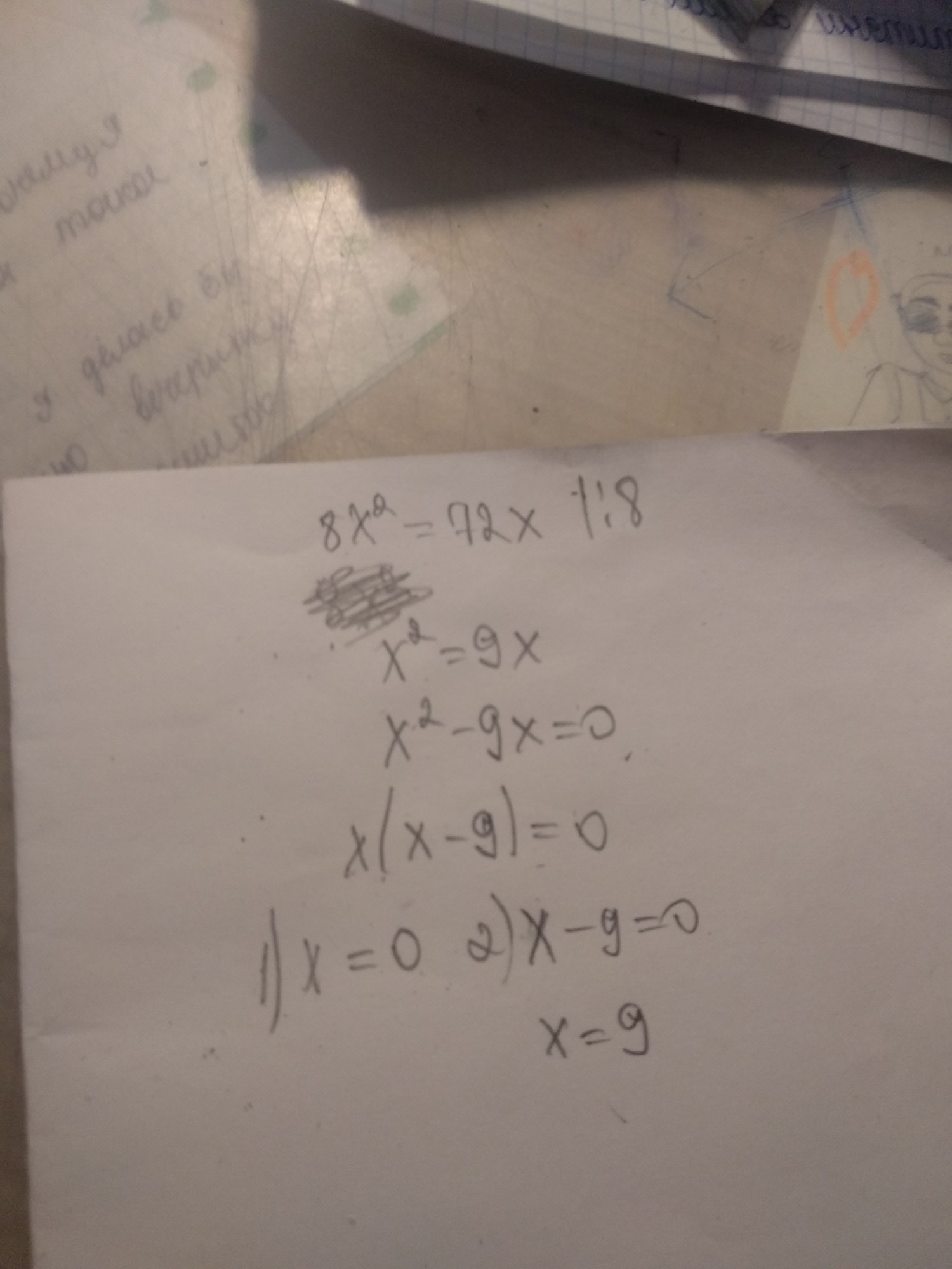 РЕШИТЕ УРАВНЕНИЕ 8х^2=72х. Если уравнение имеет более одного корня , в ответе запишите меньший из корней .