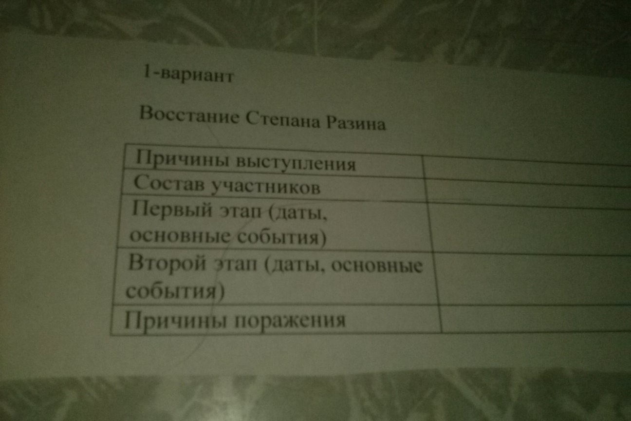 1.В советской историографии причинами указывается то, что срок сыска беглых крестьян стал бессрочным, проявлялся чрезмерный феодальный гнет. Ещё одной причиной было усиление централизованной власти. Вполне возможно, что непосредственной причиной войны стало общее ослабление экономики страны в результате затяжной войны с Речью Посполитой и Османской империей за Украину. Увеличивается государственный налог. Начинается эпидемия моровой язвы и массовый голод.2.атаманов Василия Уса и Фёдора Шелудяка,Степана Разина,Фрол Разин.3. Поход за зипунами (1667—1669) — поход повстанцев «за добычей».4.Весной 1670 года начался второй период восстания, то есть собственно война.5.Опасаясь расправы, казачья верхушка во главе с войсковым атаманом Корнилом Яковлевым выдала Разина властям. В июне 1671 года он был четвертован в Москве; через несколько лет был также казнён его брат Фрол.