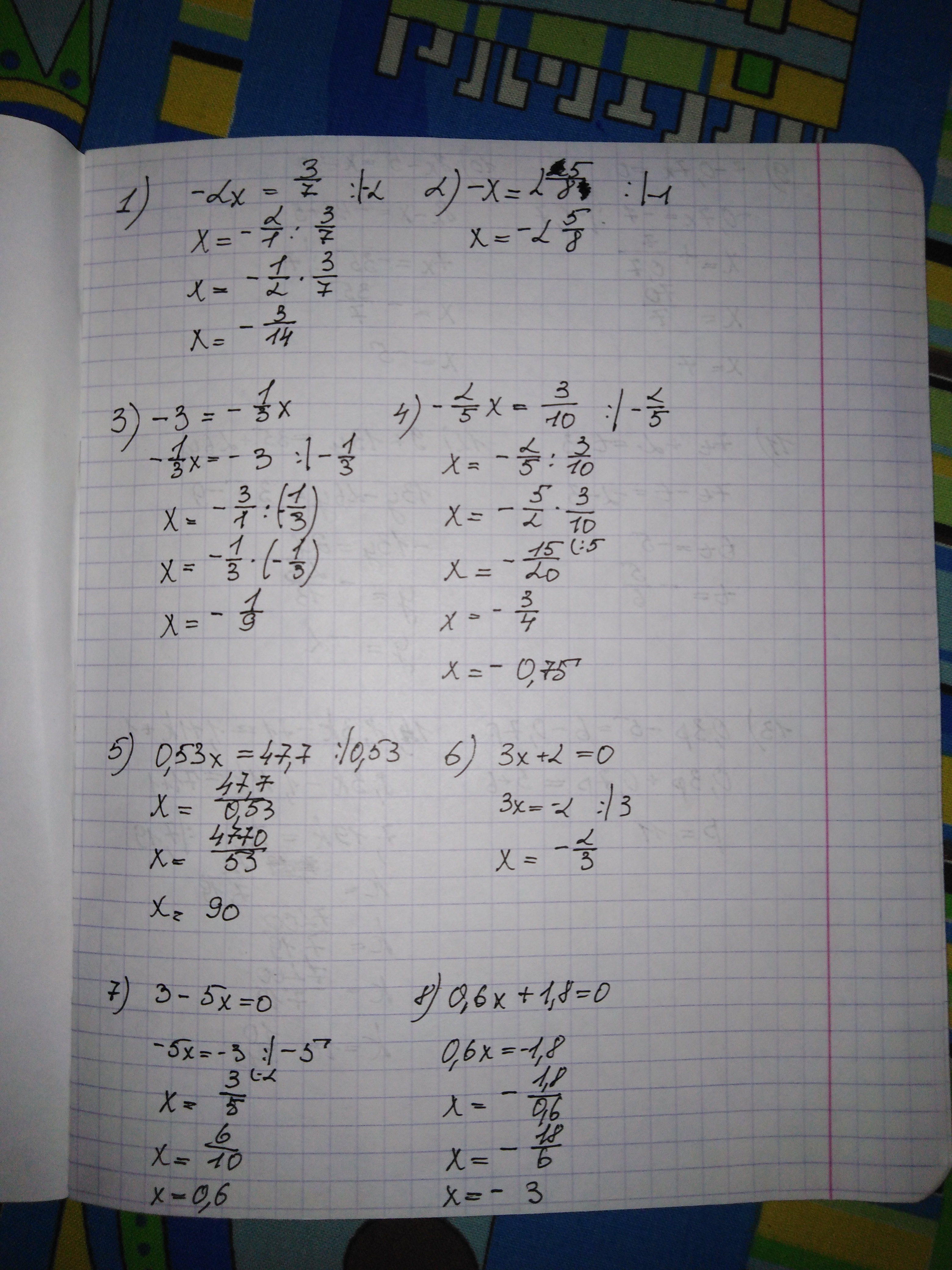 1)-2х=3/7 2)-х=-2 5/8 3) -3=-1/3х 4)-2/5х=3/10 5) 0,53х=-47,7 6) 3х+2=0 7) 3-5х=0 8)0,6х+1,8=0 9)7-0,7х=0 10)8х-5=х-40 11)7t+2l=t-3 12)9+13y=35+26y 13)0,3р-5=6-0,7р 14)8,3lk-71=1,11k+1 15)9с+2,65=36,85-9с
