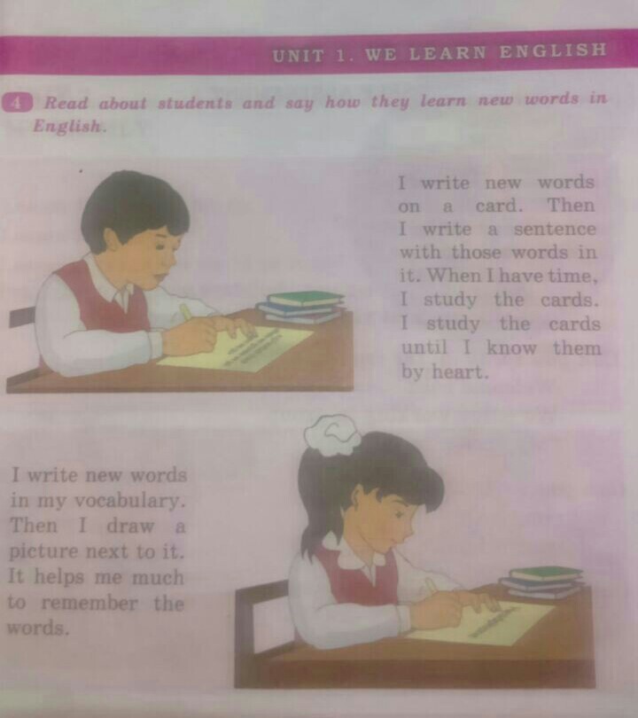 В задании нужно прочитать тексты и рассказать, как эти ученики изучают новые слова.