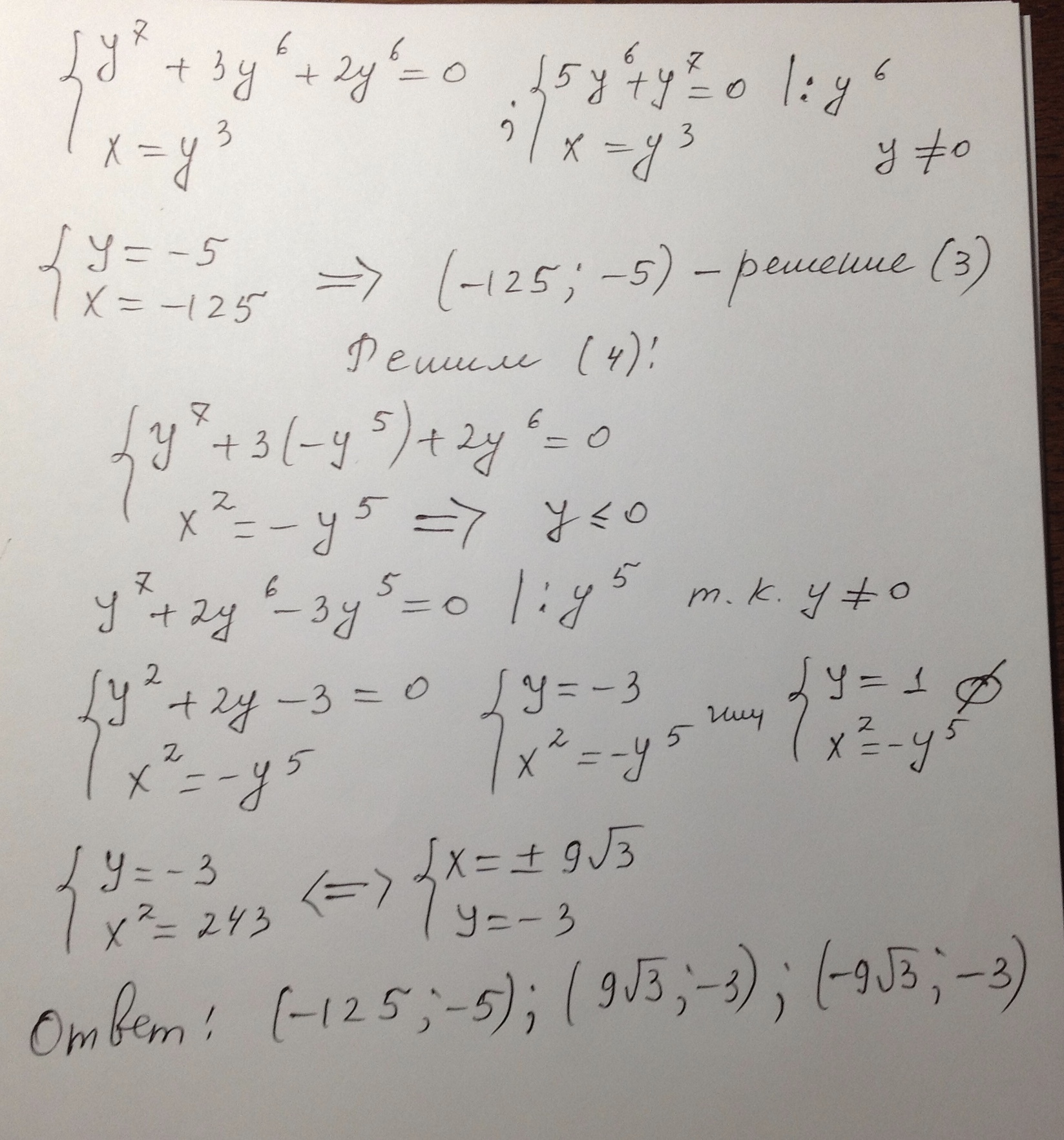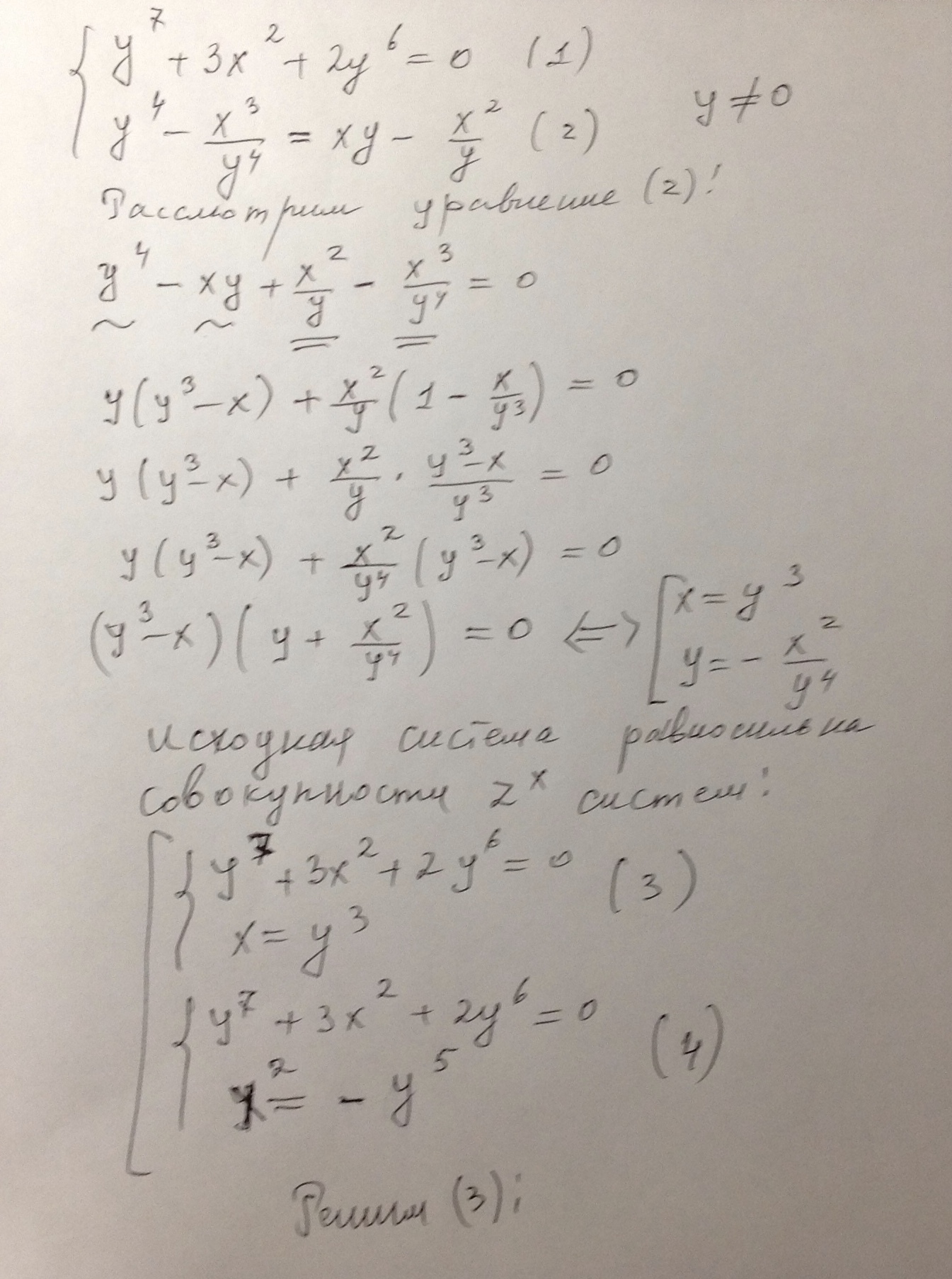 [tex]begin{array}{l}left{y^7+3x^2+2y^6=0\y^4-(x^3/y^4)=xy-(x^2/y)right.[tex]