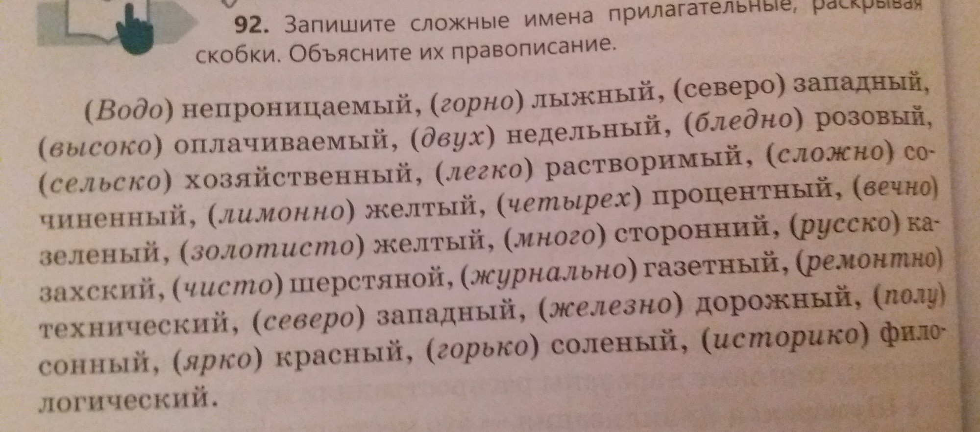 водонепроницаемый, горнолыжный, северо-западный, высокооплачиваемый, двухнедельный, бледно-розовый, сельскохозяйственный, легкорастворимый, сложносочинённый, лимонно-жёлтый, четырёхпроцентный, вечнозелёный, золотисто-жёлтый, многосторонний, русско-казахский, чистошерстяной, журнально-газетный, ремонтно-технический, северо-западный, железнодорожный, полусонный, ярко-красный, горько-солёный, историко-филологический.