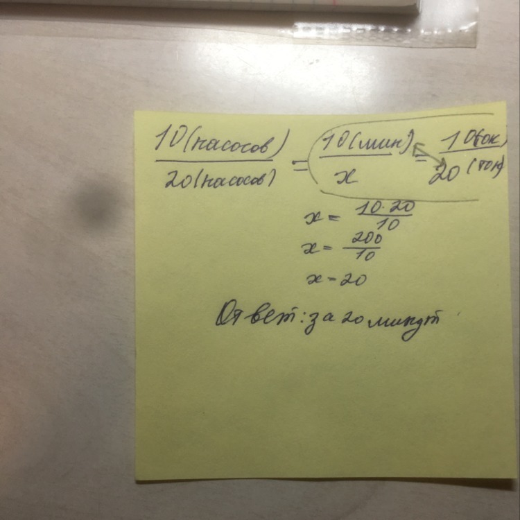 10 насосов за 10 мин выкачивают 10 т воды. За сколько мин 20 таких же насосов выкачают 20 т воды?