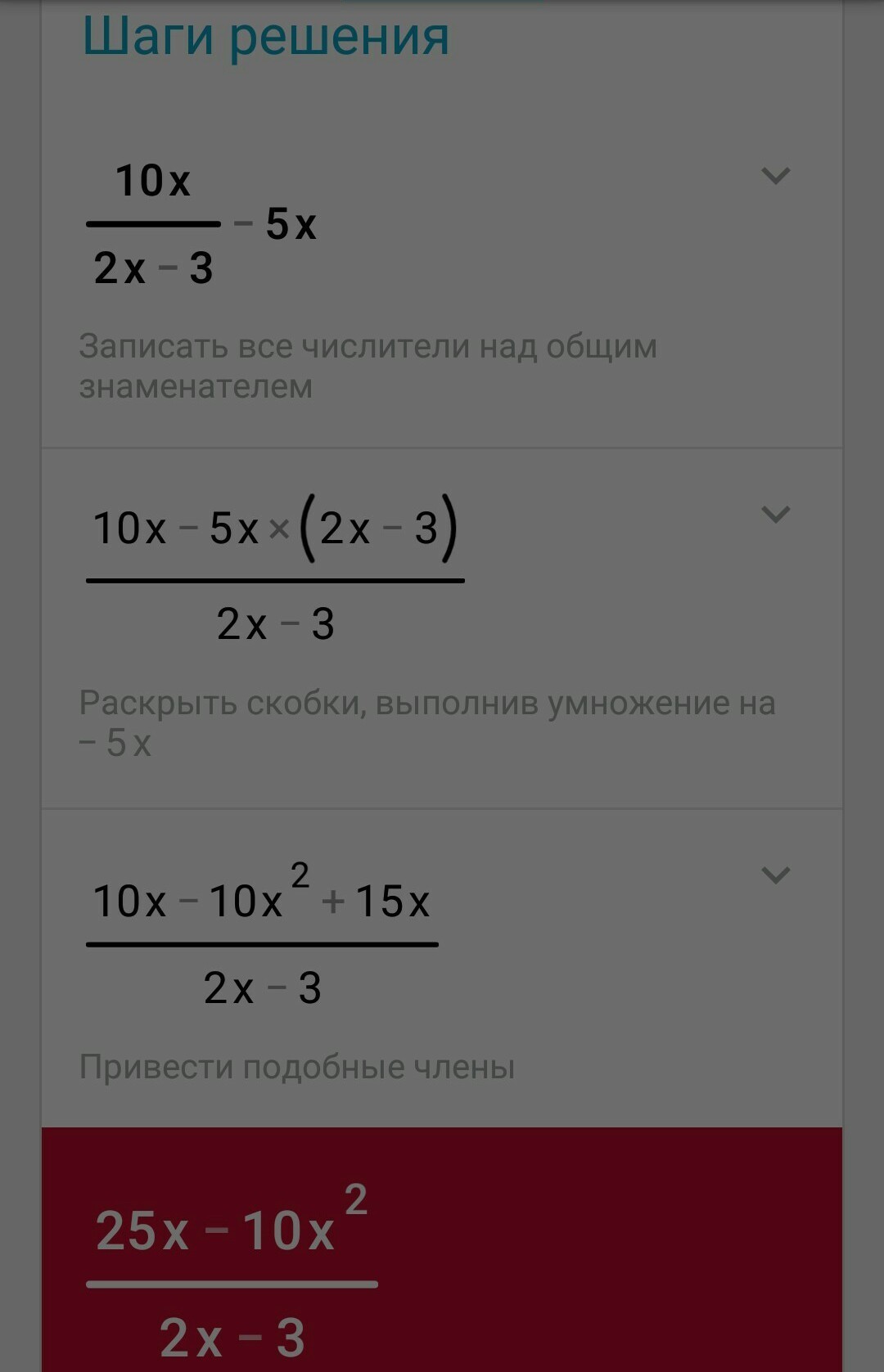 5)10x/2x-3-5x=10x-10x^2+15x/2x-3=25x-10x^2/2x-3 ; 25*0.5-10*(0.5)^2/2*(0.5)-3=12.5-2.5/1-3=10/-2=-5
