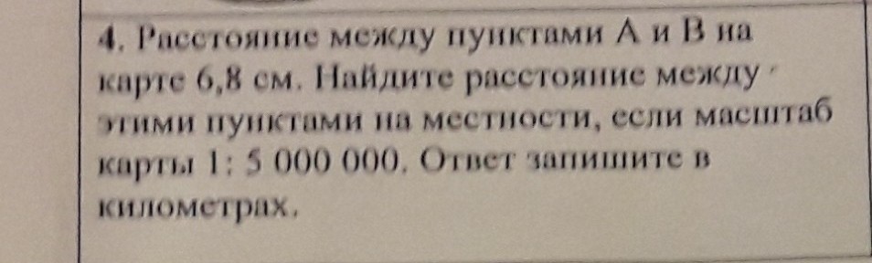 расстояние между пунктами А и Б на карте 6,8. Найдите расстояние между этими пунктами на местности, если масштаб карты 1 :5 000 000. Ответ запишите в километрах