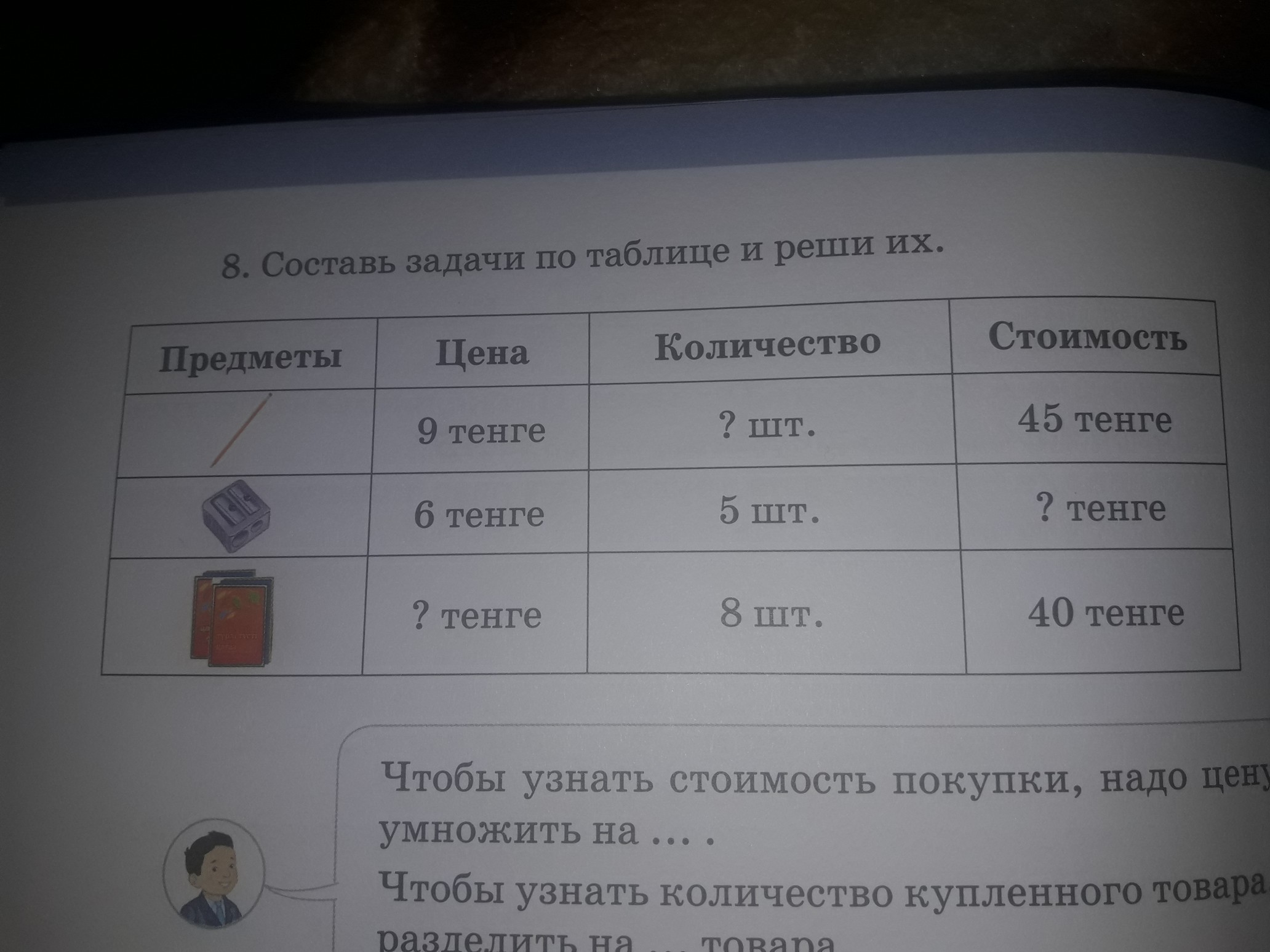 Ответ: Всего купили 18 предметов и заплатили 105 тенге.