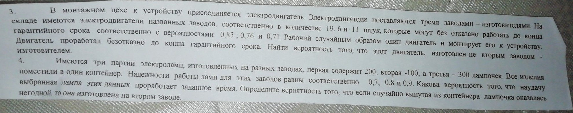 Гипотеза Hi – рабочий возьмет двигатель из продукции “i”-го завода. Из условия задачи P(H1)=19/36, т.к. всего двигателей 36, а первый завод поставил 19; P(H2)=6/36; P(H3)=11/36. , следовательно гипотезы H1, H2, H3 образуют полную группу. Условная вероятность того, что двигатель не выйдет из строя, если он изготовлен первым заводом P(A/H1)=0.85; для второго завода P(A/H2)=0.76; для третьего - P(A/H3)=0.71. По формуле Бейеса найдем условные вероятности гипотез
