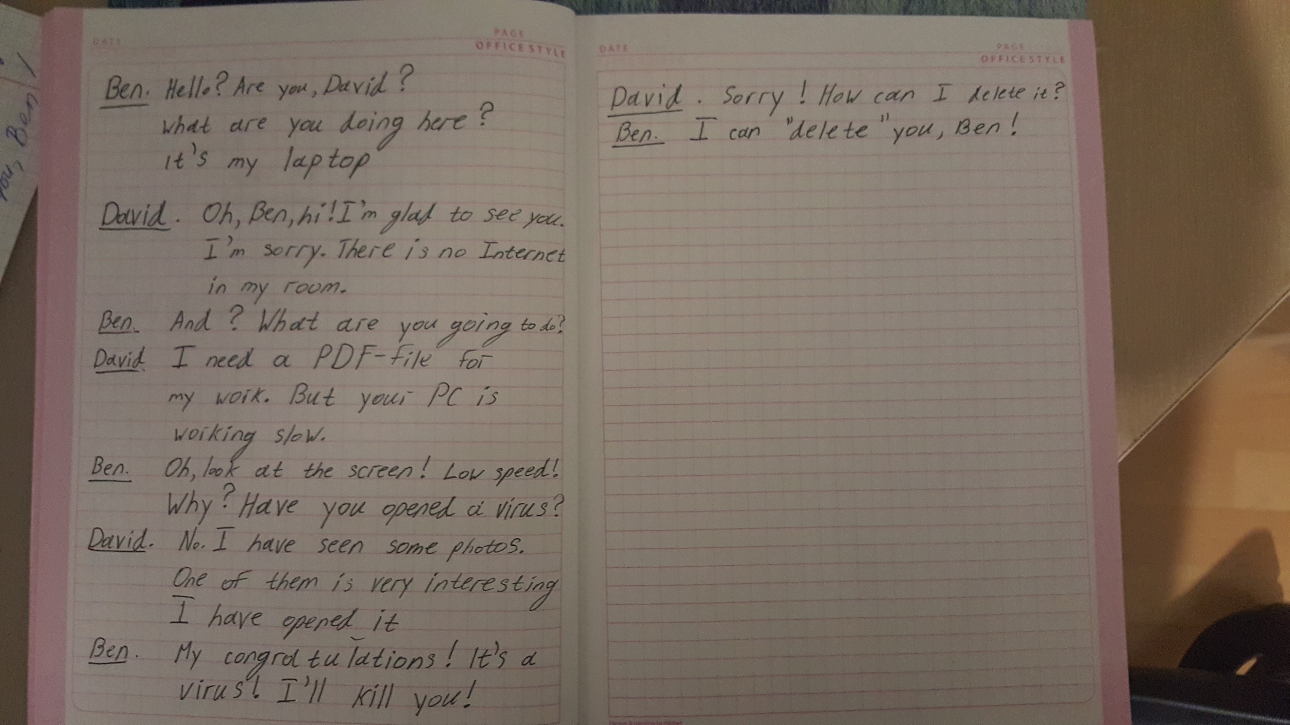 Бен: Привет. Ты Давид? Что ты тут делаешь Это мой лэптоп.
