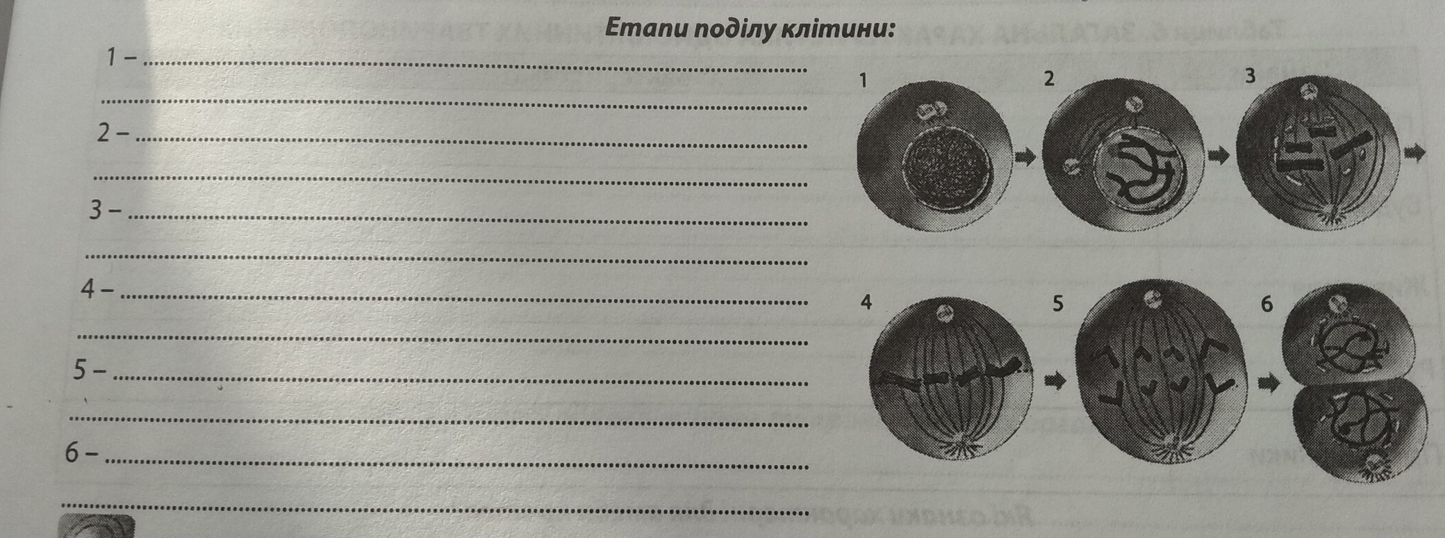 1интерфаза 2профаза 3 прометофаза 4 метафаза 5анафаза 6 телофаза