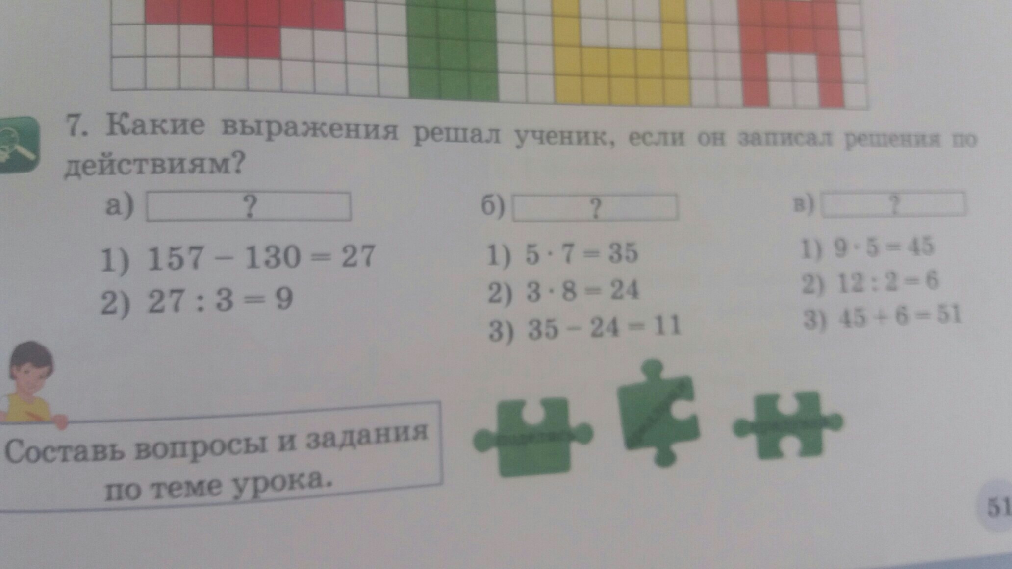 в) 9 • 5 + 12 : 2 = 51