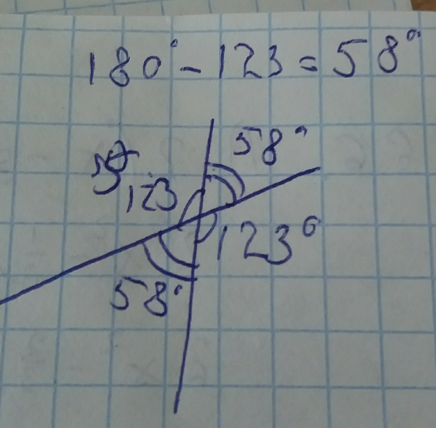 Решите задачу.а)Один из углов,образованных при пересечении двух прямых ,равен 123.Найдите остальные углы.б)Один из смежных углов в пять раз больше другого.Найдите эти углы.