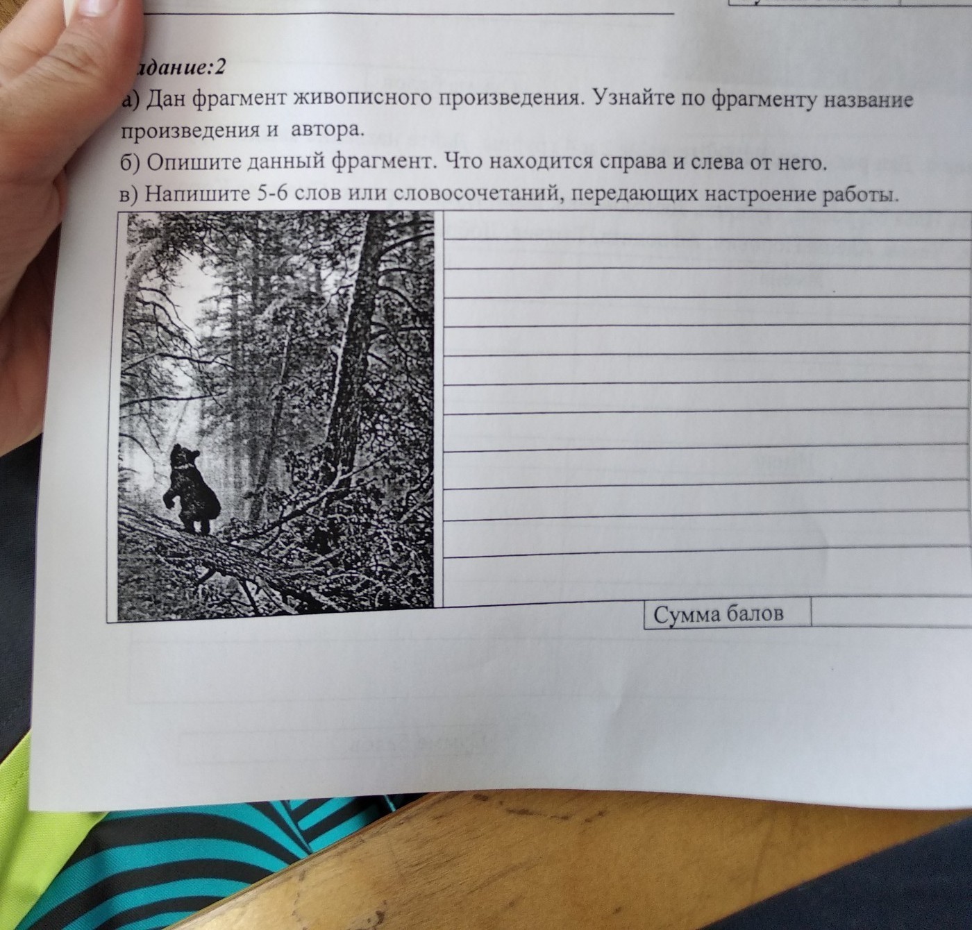 Фрагмент из картины Мишка в лесу 2) слева находится Медведь справа лес здесь имеется переплата цвет черный и не резкий переход в светлый 3) словосочетание возьми с предыдущего