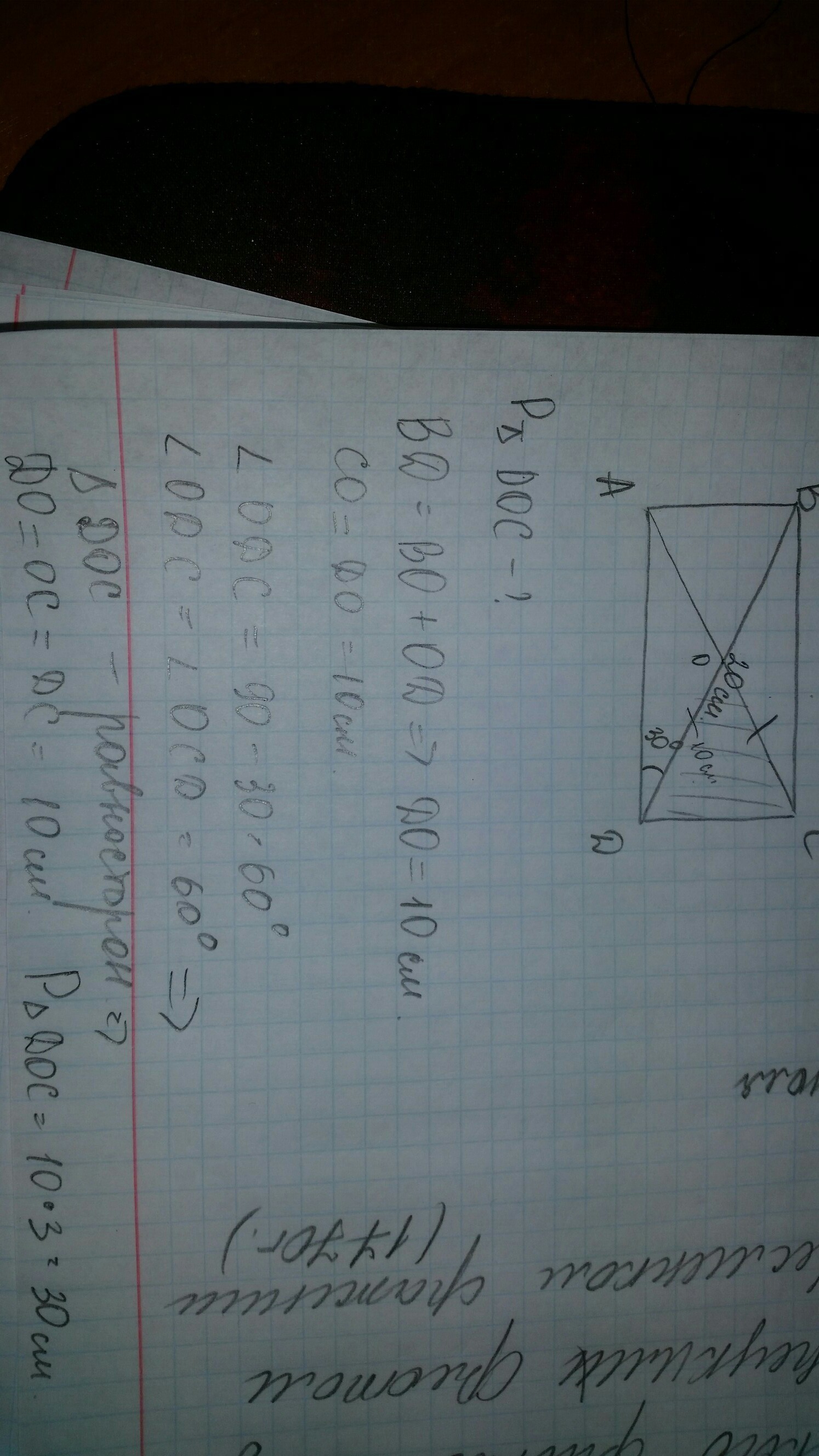 Диагонали прямоугольника АВСD пересекаются в точке О. угол АDB = 30 °, BD = 20 см. Найдите периметр треугольника DOC