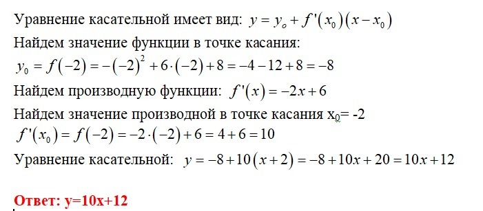 Найдите уравнение касательной к графику функции f(x)=-x^2+6x+8 в точке с абсциссой x0=-2