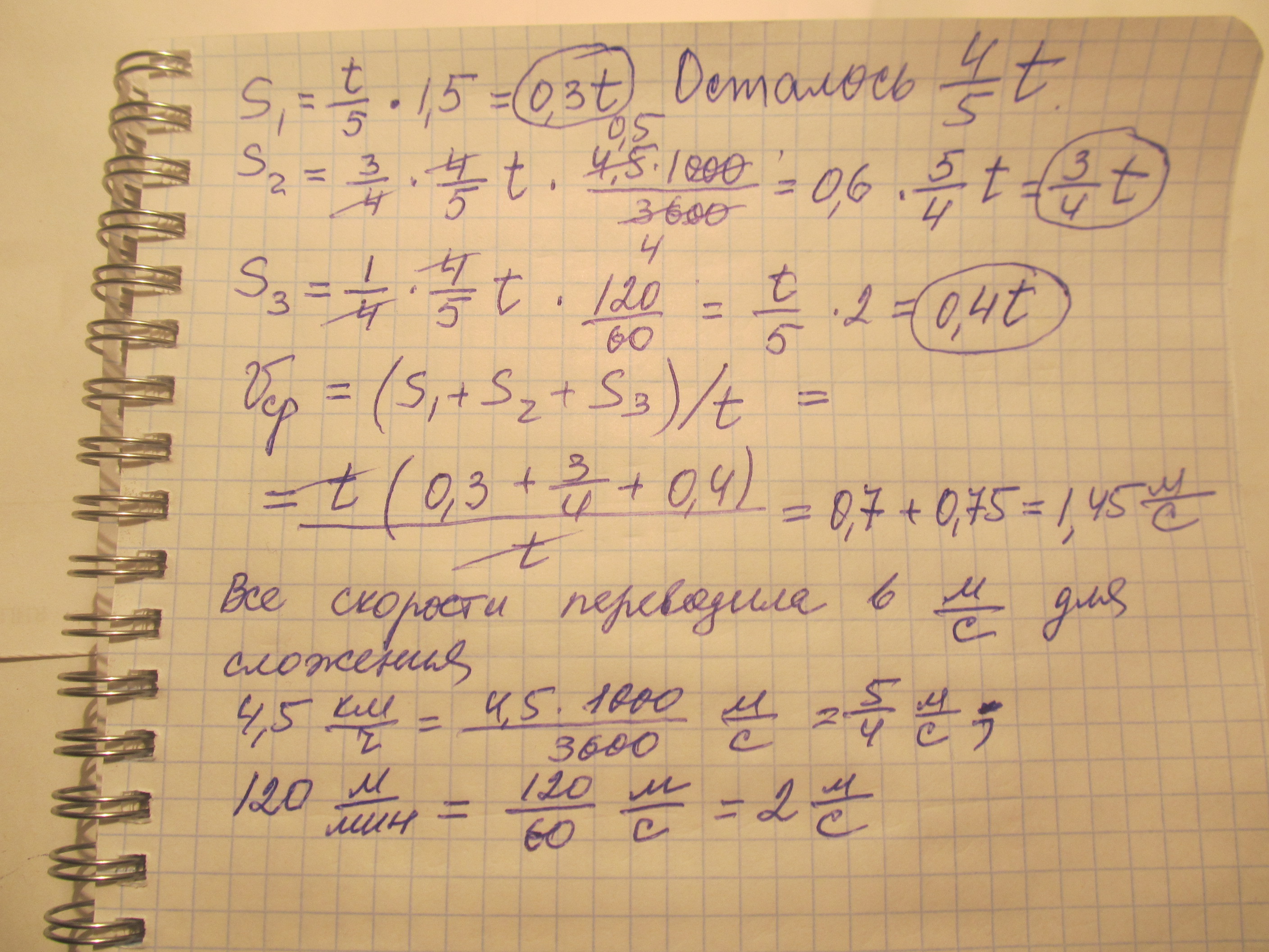 Рано утром девочка Наташа пошла в школу. Пятую часть времени своего движения она шла со скоростью 1.5 м/с затем три четверти оставшегося времени ее скорость была равна 4.5 км/ч. Поняв, что опаздывает, Натага остаток времени стала идти быстрее со скоростью 120 м/мин. Определите среднюю скорость девочки на всем пути.