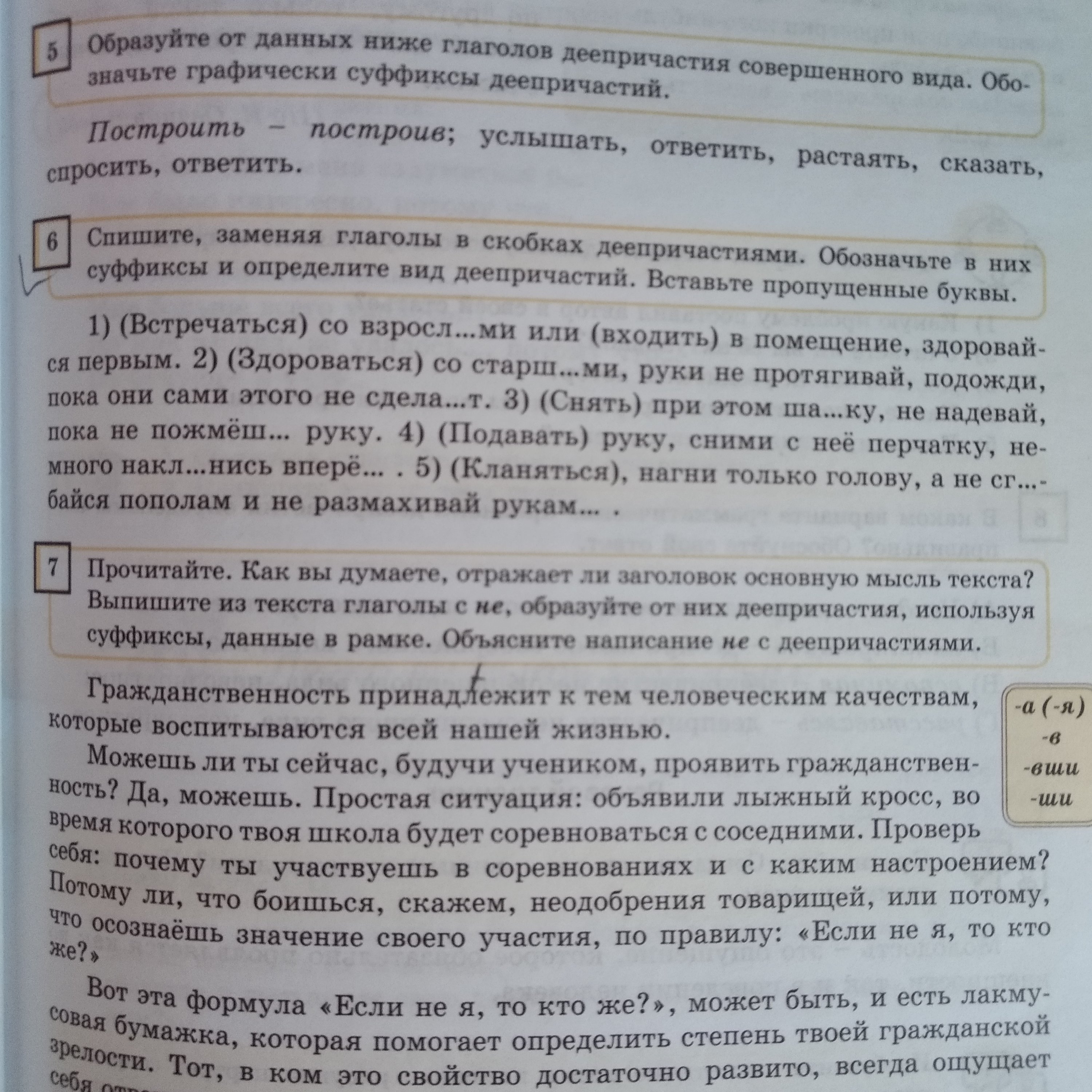 Встречаясь( несов.вид) со взрослыми или находясь(несов вид) в помещении, здоровайся первым. Здороваясь( несов.вид)со старшими, руки не протягивай, подожди, пока они сами этого не сделают. Сняв( сов.вид) при том шапку, не надевай, пока не пожмёшь руку. Подавая( несов.вид) руку, сними с неё перчатку, немного наклонись вперёд. Кланяясь( несов.вид), нагни только голову, а не сгибайся пополам и не размахивай руками.