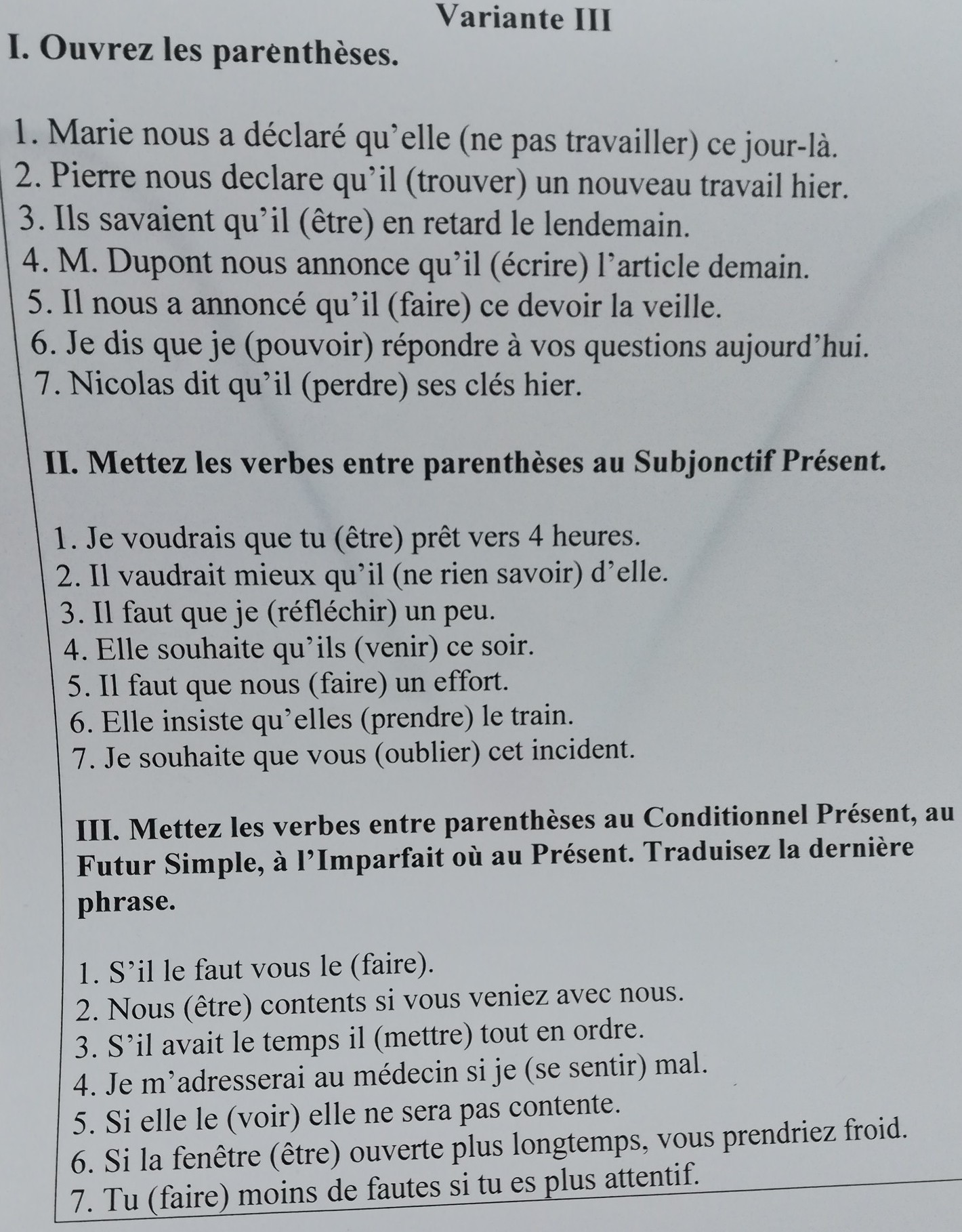 III. Mettez les verbes entre parenthèses au conditionnel présent, au futur simple, à l’imparfait, ou au présent.