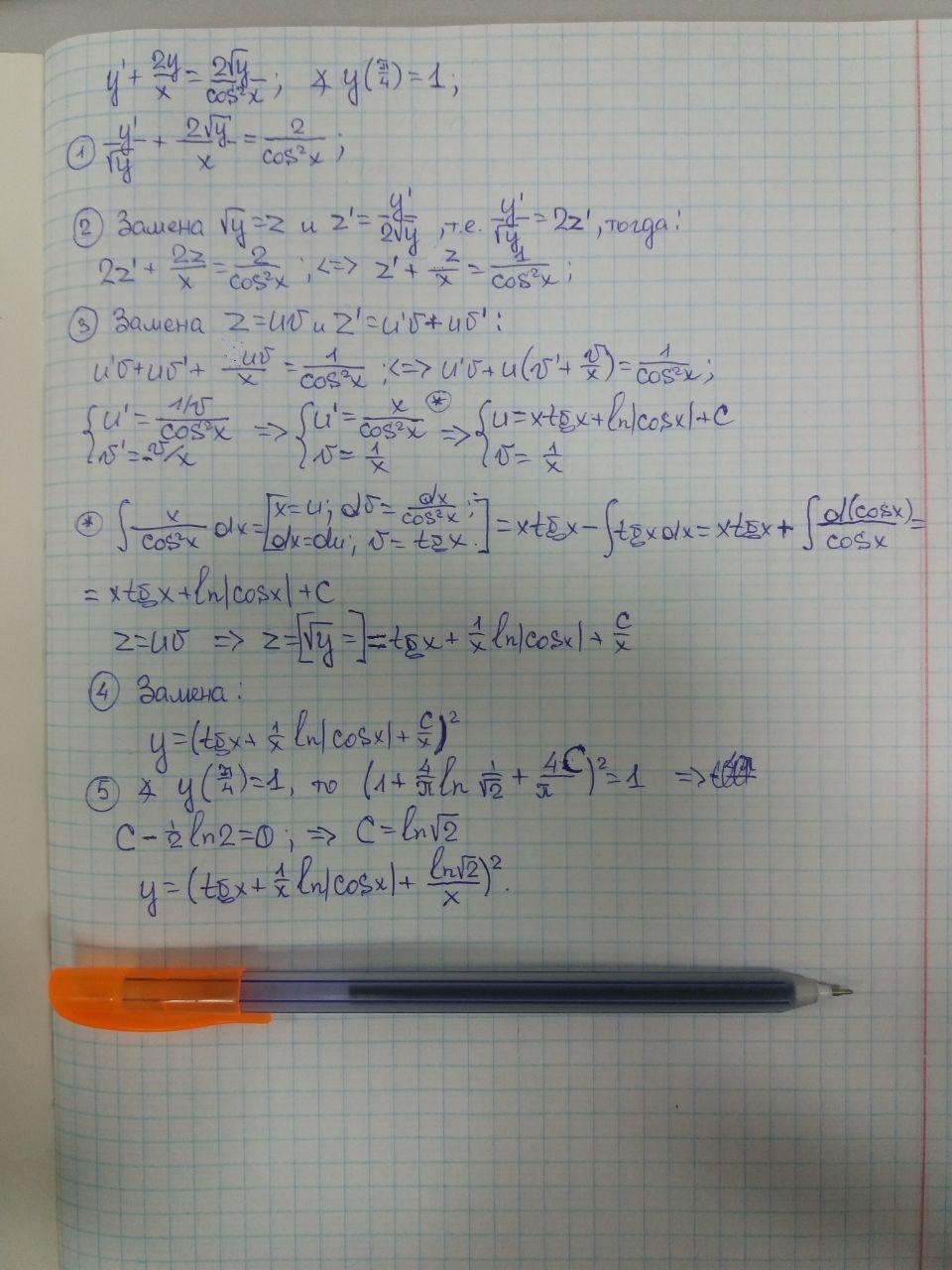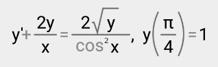 y'+(2y/x)=(2sqrt(y)/cos^(2)x)), y(P/4)=1 - уравнение Бернулли