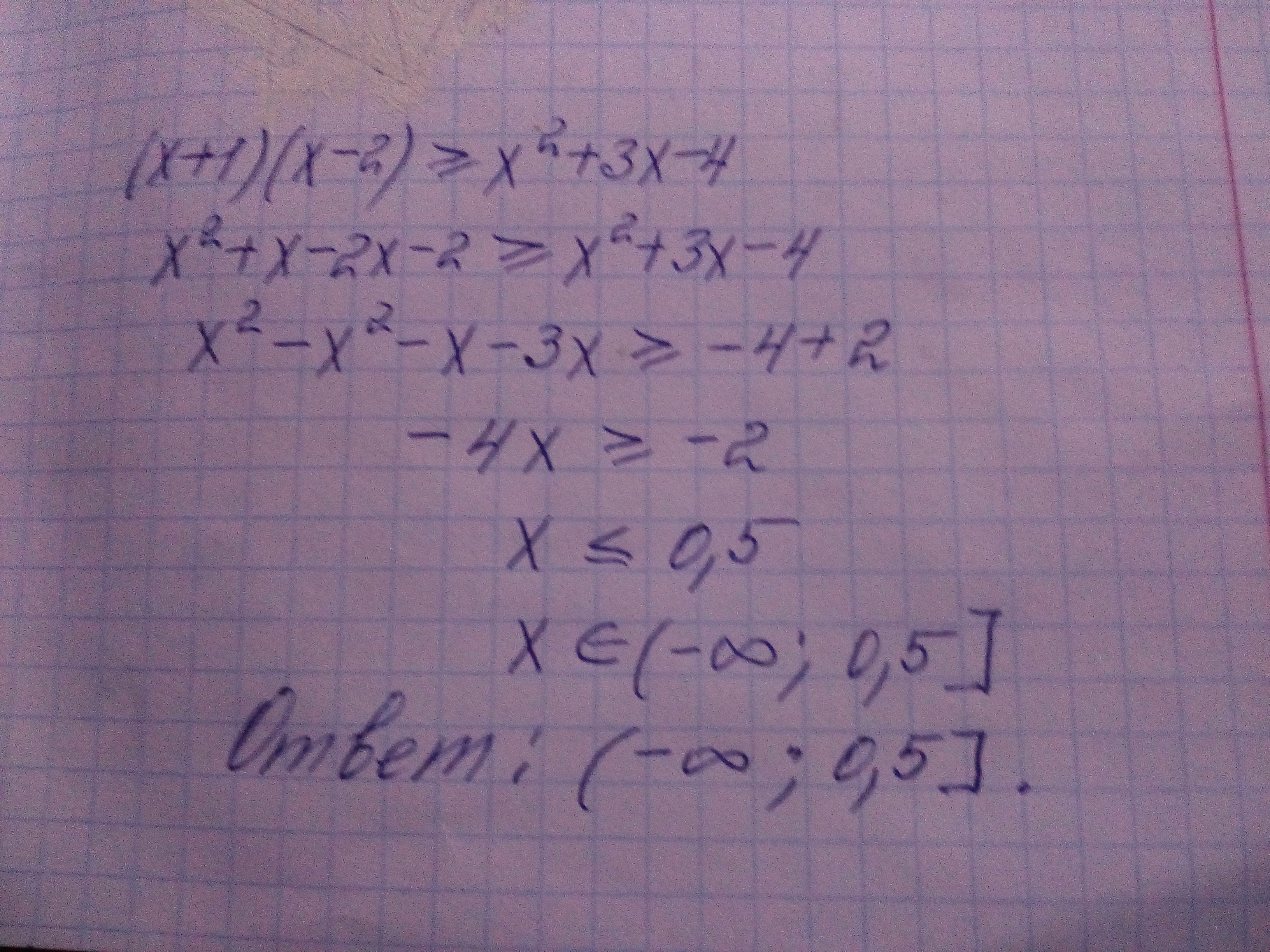 "решение" ( x+1)(x-2)⩾ x²+3x-4 ⇔ x²- x-2 ⩾ x²+3x-4 ⇔ 2 ⩾ 4x ⇔ x ≤ 0,5.