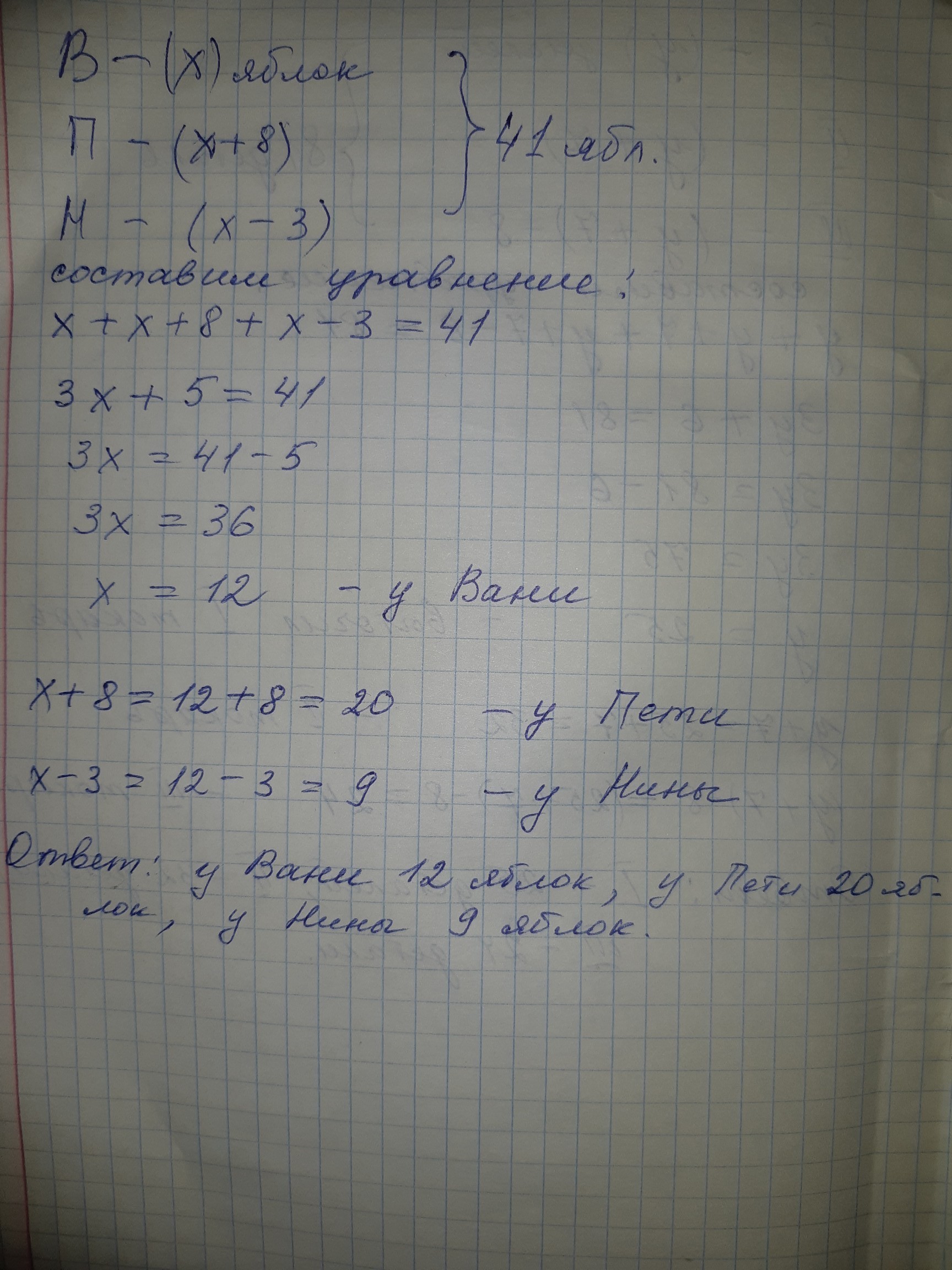 а) У Вани было х яблок, у Пети - на 8 яблок больше, а у Нины - на 3 яблока меньше,чем у Вани.Вместе у них было 41 яблоко.