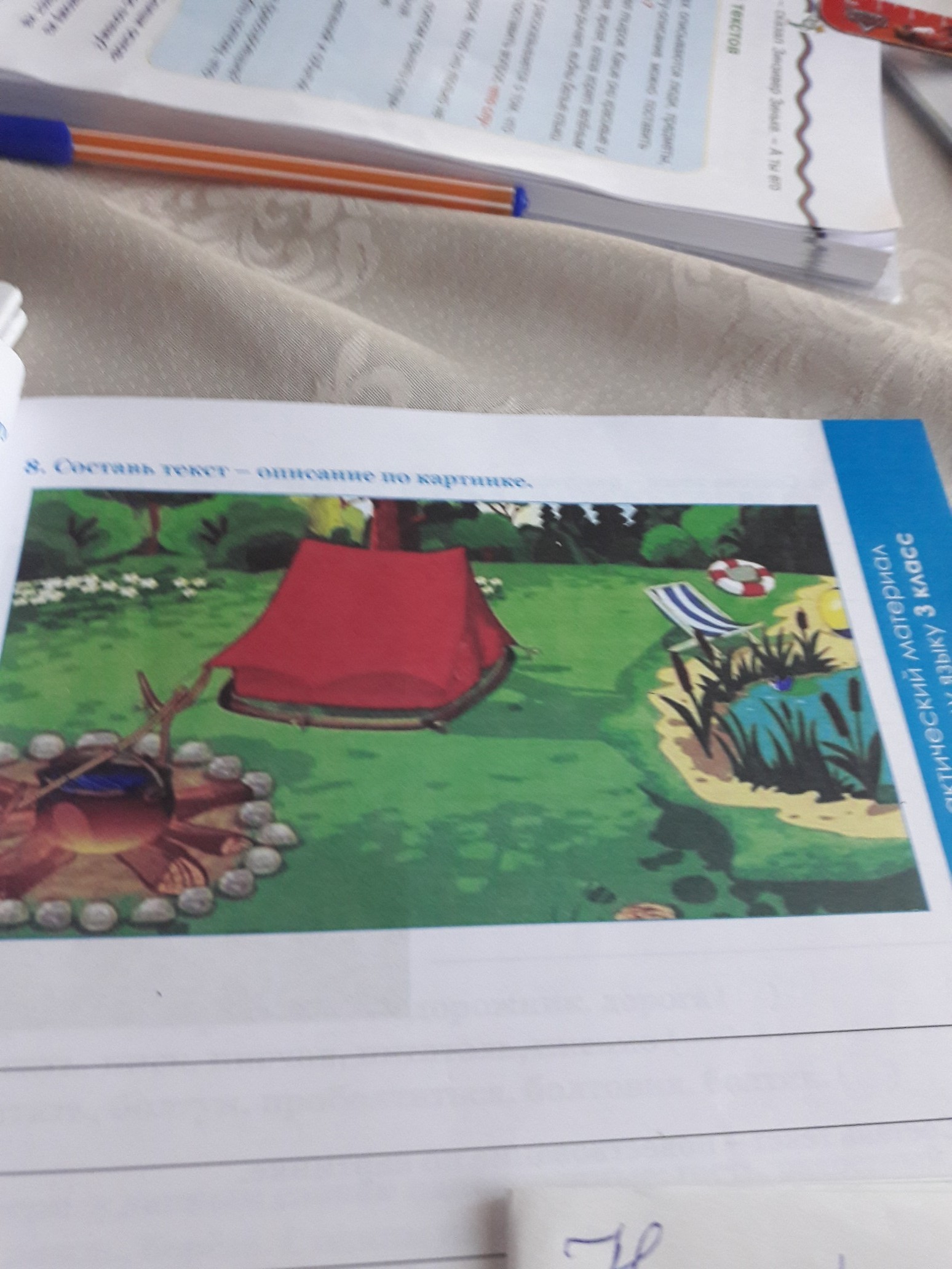 На лугу стоит палатка красного цвета, котёл в котором варят пищю и пруд в котором можно купаться, а не подолёку песочница.