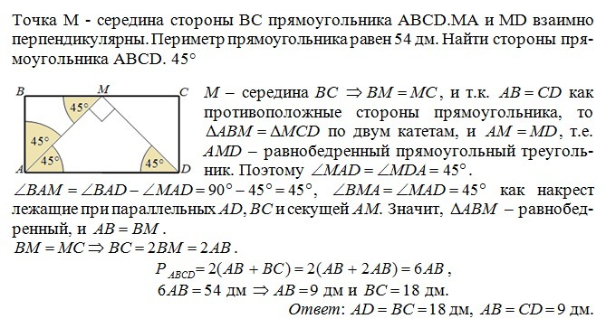 Точка М- середина сторони ВС прямокутника АВСD.MA i MD взаємно перпендикулярні.Периметр прямокутника рівний 54 дм.Знайти сторони прямокутника АВСD