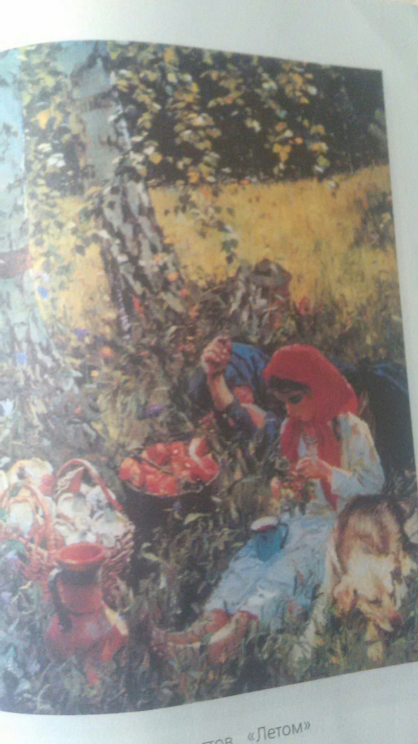 На полотне мастер изобразил знойный летний день. Под березкой расположились грибники и их собака. На переднем плане картины изображена девочка в белом платье и красной косыночке. Она сидит на траве, вытянув босые ноги, обрывает с веточки спелые ягоды и складывает их в кружечку. Я внимательно вглядываюсь в лицо девочки. Оно загорелое, на смуглых щеках играет румянец. Глаза девочки опущены. Из-под косыночки выбиваются темные волосы, падая на грудь. Рядом с девочкой, положив голову на лапы, лежит собака. Она очень устала, ей жарко.