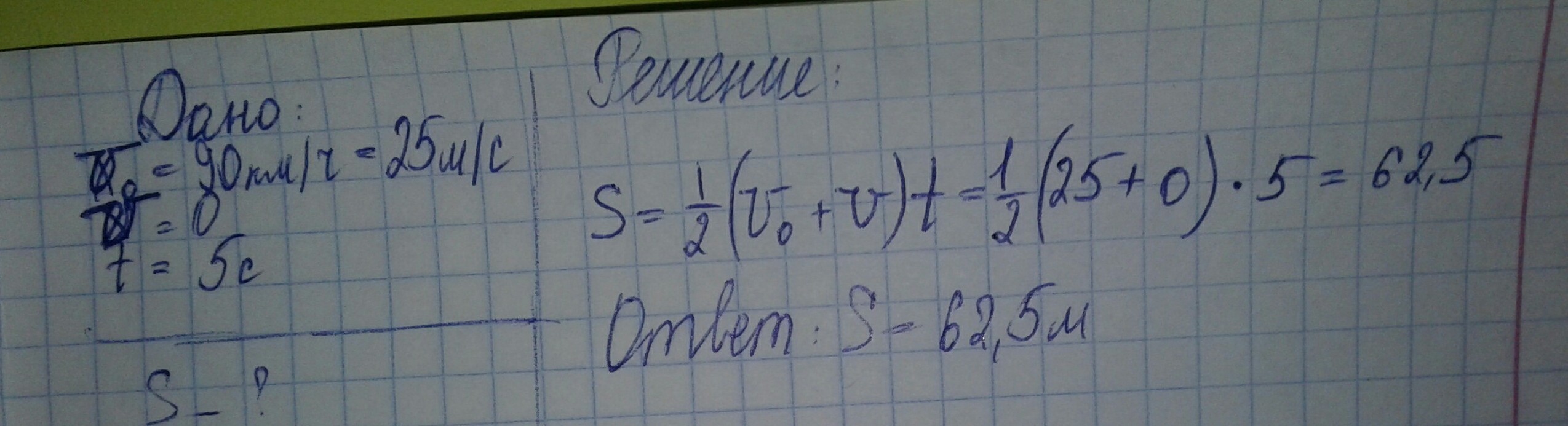 Определите тормозной путь автомобиля, если при аварийном торможении, двигаясь со скоростью 90 км/ч, он остановился через 5 с.
