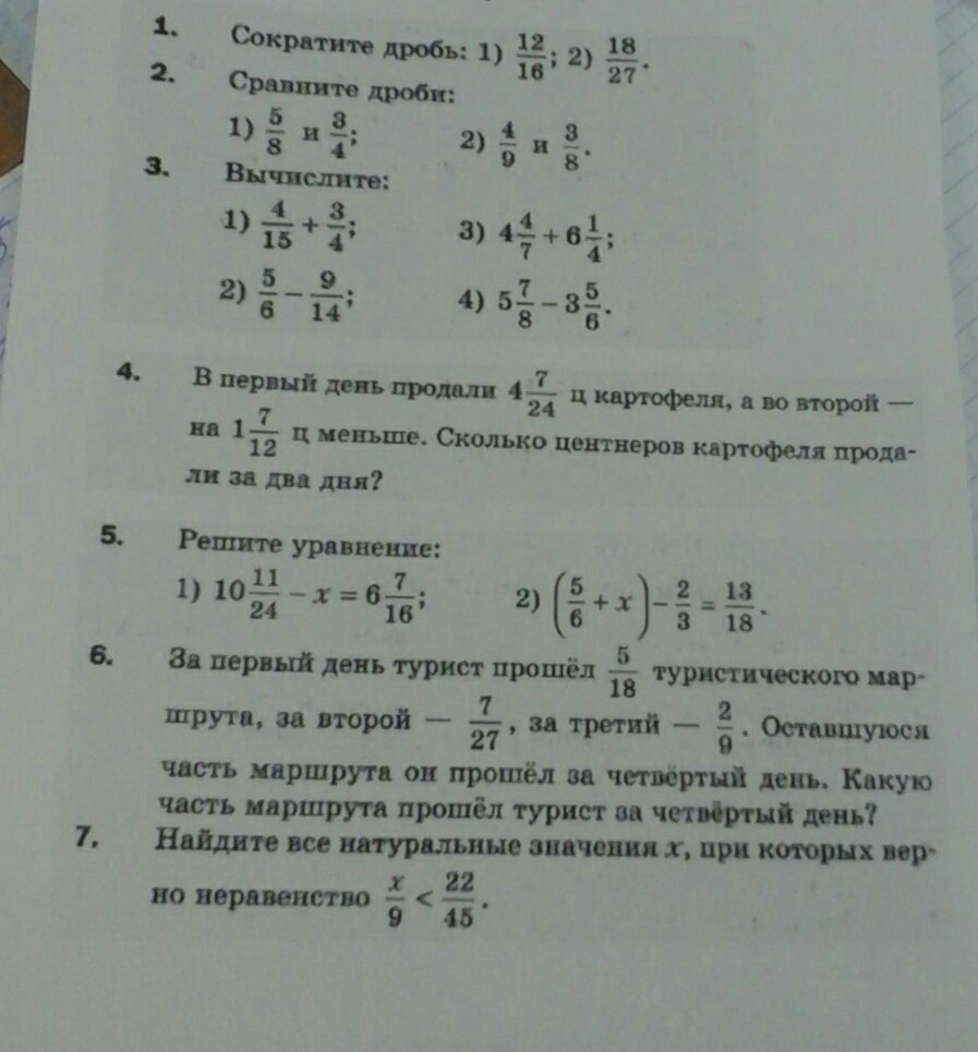 1) 5/18 + 7/27 + 2/9 = 15/54 + 14/54 + 12/54 = 41/54 прошел за три дня