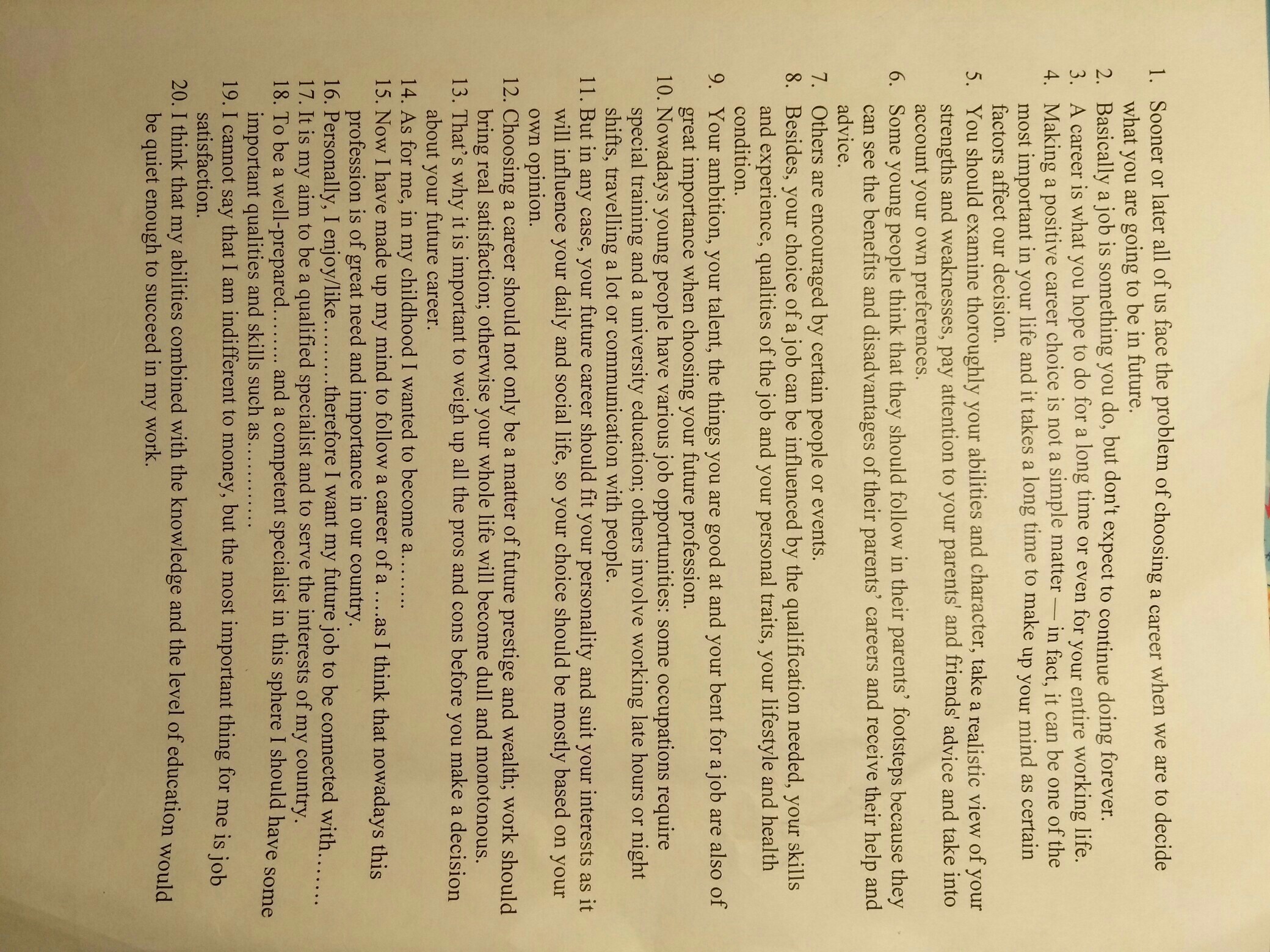 1. Рано или поздно все мы сталкиваемся с проблемой выбора карьеры, когда мы должны принять решение. 2. В основном работа, которую вы делаете, но не ожидайте продолжения навсегда. 4. Выбор положительного выбора в картере - это не простой вопрос - на самом деле, это может быть один из 5. Вы должны тщательно изучить свои способности и характер, взглянуть на них с реалистичным взглядом 6. Некоторые молодые люди думают, что им следует следовать по стопам своих родителей, потому что они, будущее. Карьера - это то, что вы надеетесь делать долгое время или даже всю свою трудовую жизнь. важная в вашей жизни, и вам нужно много времени, чтобы решить, как определенные факторы влияют на наши сильные и слабые стороны решения, обращают внимание на советы ваших родителей и друзей и учитывают ваши собственные предпочтения, могут видеть бенелиты и дезавуировать родительскую карьеру и повторять их помощь и советы. Другие поощряются определенными людьми или событиями. 8. Кроме того, на ваш выбор работы может влиять необходимая квалификация, ваши навыки. 9. Ваши амбиции, ваш талант, то, что у вас хорошо и на работу, также составляют 10. В настоящее время у молодых людей есть разные возможности трудоустройства: некоторые профессии требуют 11. Но в любом случае ваша будущая карьера должна соответствовать вашей индивидуальности и соответствовать вашим интересам. 12. Выбор карьеры должен быть не только вопросом будущего престижа и богатства; работа должна 13. Вот почему важно взвесить все плюсы и минусы, прежде чем принимать решение и экспериментировать, качество работы и ваши личные качества, свой образ жизни и состояние здоровья большое значение при выборе вашей будущей профессии. специальная подготовка и высшее образование; другие включают в себя работу с поздними часами или ночными сменами, много путешествуя или общение с людьми повлияет на вашу повседневную и социальную жизнь, поэтому ваш выбор должен быть в основном сделан по вашему мнению. принести реальную удовлетворенность; иначе вся твоя жизнь станет скучной и однообразной в будущей карьере 14. Что касается меня, то в детстве я хотел стать ..... 15. Теперь я решил заняться карьерой ... . Я думаю, что в наши дни эта профессия очень важна и важна в нашей стране, поэтому я хочу, чтобы моя будущая работа была связана с 16. Лично мне нравится / нравится 17. Моя цель - стать квалифицированным специалистом и служить интересы моей страны 18. Быть хорошо подготовленным ....... а и компетентным специалистом в этой сфере у меня должно быть около 19. Я не могу сказать, что я безразличен к деньгам, но самое главное для меня это работа 20. Я думаю, что мои способности в сочетании со знаниями и уровнем образования будут важными качествами и навыками, такими как. удовлетворение. будьте спокойны, чтобы преуспеть в моей работе.