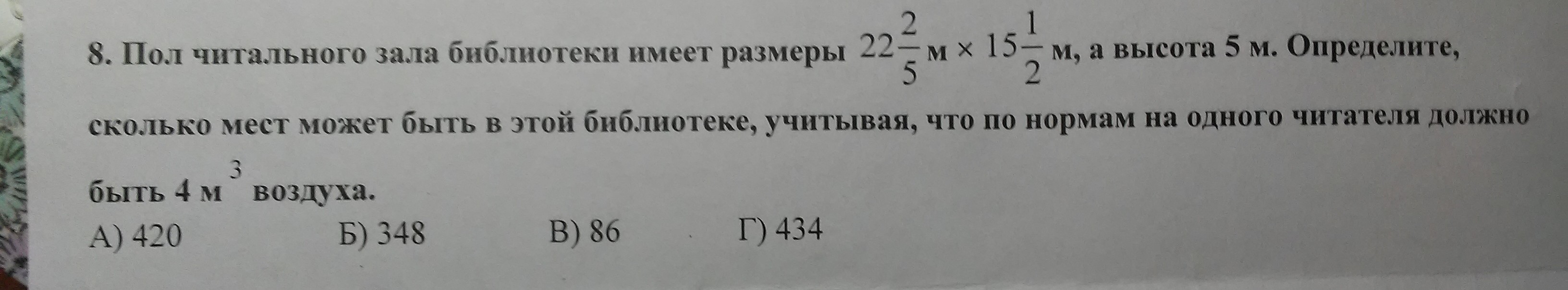 Зная что на одного читателя должно приходится по 4 м^3 воздуха, получим