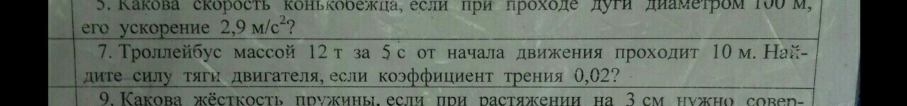 Троллейбус массой 12 т за 5 с от начала движения проходит 10 м. Найдите силу тяги двигателя, если коэффициент трения 0,02?