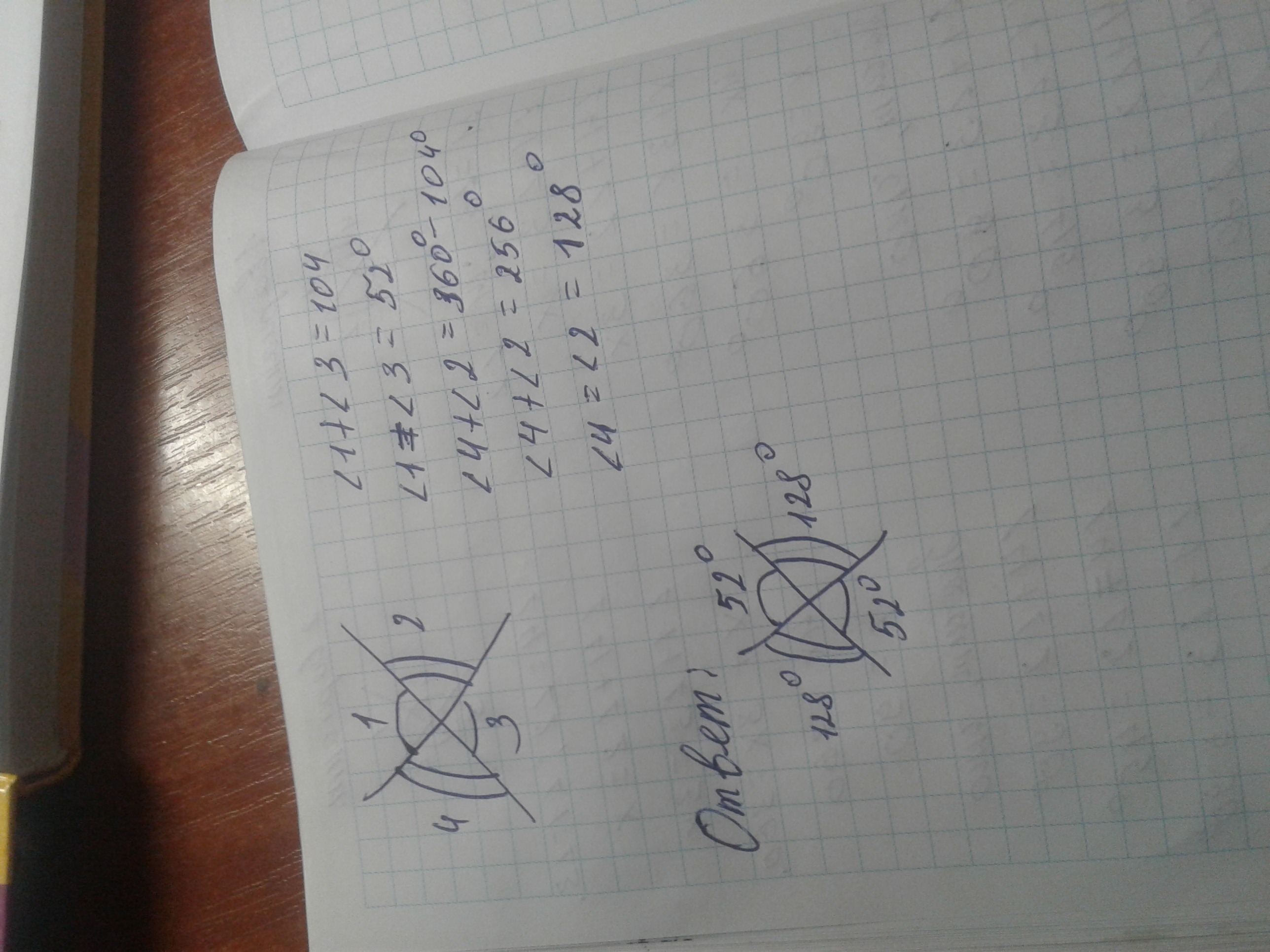 Найдите неразвернутые углы, образованные при пересечении двух прямых, если сумма двух из них равна 104 градусам