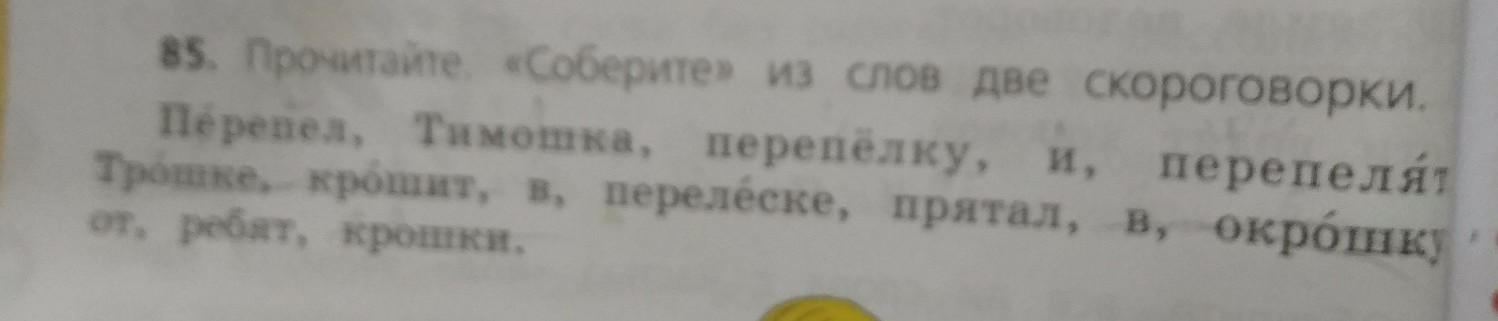 Тимошка Трошке в окрошку крошит крошки. Перепел перепёлку и перепелят прятал в перелеске от ребят.