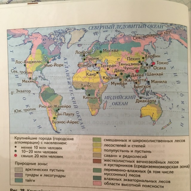 Почему на острове Ява плотность населения больше 1000 чел/км ²? По рис. 28 определите, на каких материках, в каких природных зонах расположены крупнейшие города мира.