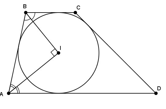 Сумма углов трапеции, прилежащих к боковым сторонам, равна 180°. Поэтому сумма углов ABI и IAB (см. рисунок; I — точка пересечения биссектрис) равна