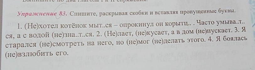 1) Не хотел котёнок мыться - опрокинул он корытце. Часто умывается, а с водой не знается. 2) Не лает, не кусает, а в дом не пускает. 3) Я старался не смотреть на него, но не мог не делать этого. 4) Я боялась невзлюбить его.