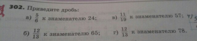 Приведите дробь 5/6 к знаменателю 24 11 19 к знаменателю 57 12 13 к знаменателю 65 12,13 78