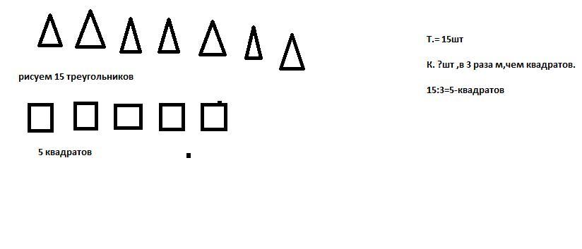 На доске 15 треугольников,что в 3 раза больше,чем квадратов,Нарисуй условие и запиши решение этой задачи.Составь задачу в привычном виде.